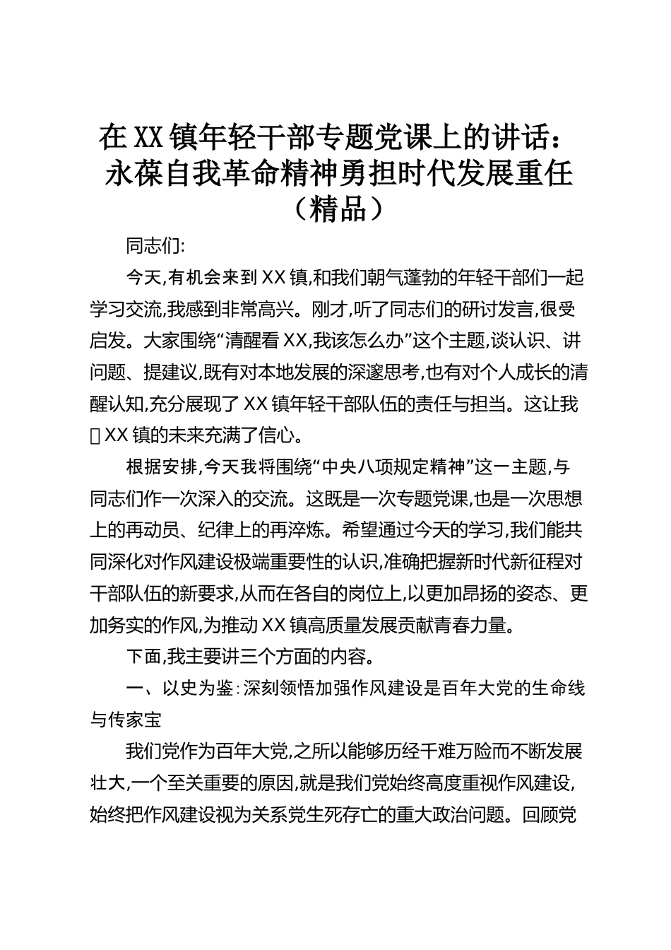 在XX鎮(zhèn)年輕干部專題黨課上的講話:永葆自我革命精神勇?lián)鷷r代發(fā)展重任(精品)
