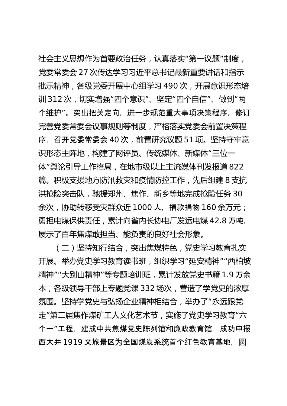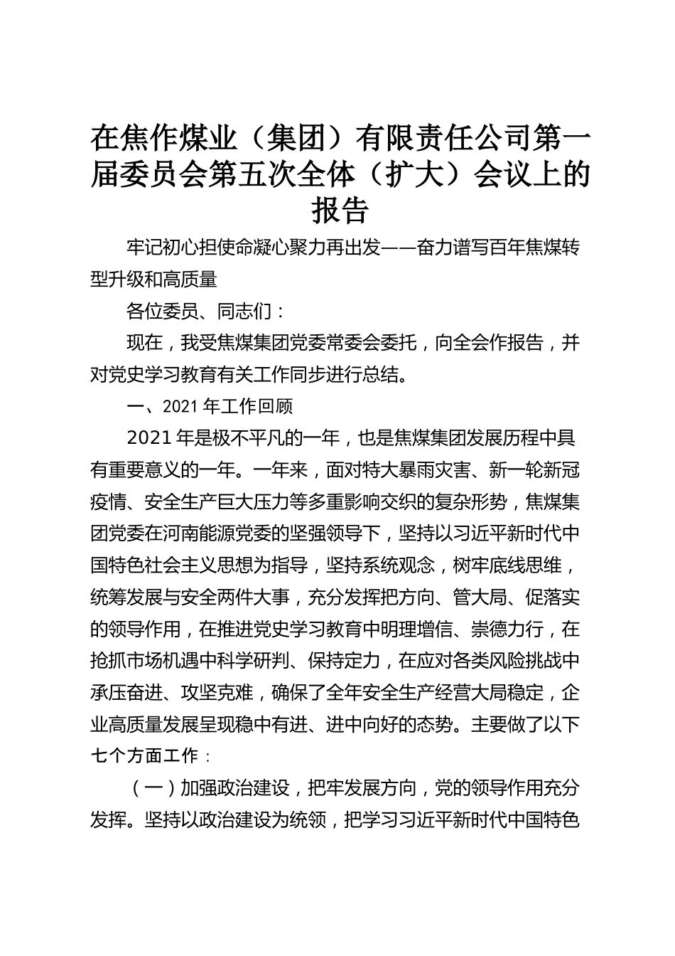 在焦作煤業(yè)(集團)有限責任公司第一屆委員會第五次全體(擴大)會議上的報告牢記初心擔使命凝心聚力再出發(fā)——奮力譜寫百年焦煤轉(zhuǎn)型升級和高質(zhì)量各位委員、同志們:現(xiàn)在,我受焦煤集團黨委常委會委托,向全會作報告,并對黨史學習教育有關(guān)工作同步進行總結(jié)。一、2021年工作回顧2021年是極不平凡的一年,也是焦煤集團發(fā)展歷程中具有重要意義的一年。一年來,面對特大暴雨災害、新一輪新冠疫情、安全生產(chǎn)巨大壓力等多重影響交織的復雜形勢,焦煤集團黨委在河南能源黨委的堅強領(lǐng)導下,堅持以習近平新時代中國特色社會主義思想為指導,堅持系統(tǒng)觀念,樹牢底線思維,統(tǒng)籌發(fā)展...