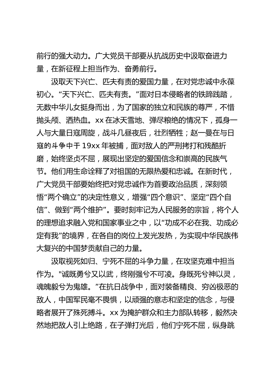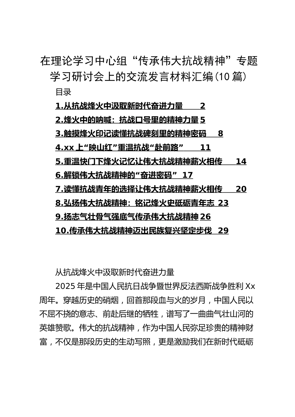 在理論學(xué)習(xí)中心組“傳承偉大抗戰(zhàn)精神”專題學(xué)習(xí)研討會上的交流發(fā)言材料匯編(10篇)目錄1.從抗戰(zhàn)烽火中汲取新時代奮進力量22.烽火中的吶喊:抗戰(zhàn)口號里的精神力量53.觸摸烽火印記讀懂抗戰(zhàn)碑刻里的精神密碼84.xx“”“上映山紅重溫抗戰(zhàn)赴前路”115.重溫快門下烽火記憶讓偉大抗戰(zhàn)精神薪火相傳146.“解鎖偉大抗戰(zhàn)精神的奮進密碼”177.讀懂抗戰(zhàn)青年的選擇讓偉大抗戰(zhàn)精神薪火相傳208.弘揚偉大抗戰(zhàn)精神:銘記烽火史砥礪青年志239.揚志氣壯骨氣強底氣傳承偉大抗戰(zhàn)精神2610.傳承偉大抗戰(zhàn)精神邁出民族復(fù)興堅定步伐29從抗戰(zhàn)烽火中汲取新時代奮進力量2025年是中國人民抗日戰(zhàn)爭暨世界反...