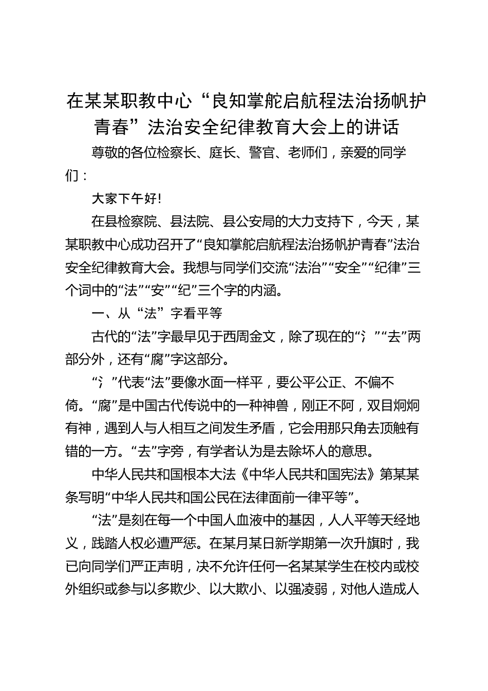 在某某職教中心“良知掌舵啟航程法治揚(yáng)帆護(hù)青春”法治安全紀(jì)律教育大會(huì)上的講話尊敬的各位檢察長(zhǎng)、庭長(zhǎng)、警官、老師們,親愛(ài)的同學(xué)們:大家下午好!在縣檢察院、縣法院、縣公安局的大力支持下,今天,某“”某職教中心成功召開(kāi)了良知掌舵啟航程法治揚(yáng)帆護(hù)青春法治“”“”“”安全紀(jì)律教育大會(huì)。我想與同學(xué)們交流法治安全紀(jì)律三“”“”“”個(gè)詞中的法安紀(jì)三個(gè)字的內(nèi)涵。一、從“法”字看平等“”“”“”古代的法字最早見(jiàn)于西周金文,除了現(xiàn)在的氵去兩“”部分外,還有腐字這部分?!啊薄啊便叽矸ㄒ袼嬉粯悠?,要公平公正、不偏不“”倚。腐是中國(guó)古代傳說(shuō)中的一種...