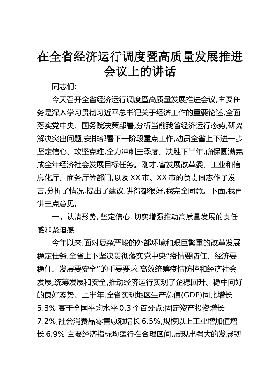 在全省經(jīng)濟(jì)運(yùn)行調(diào)度暨高質(zhì)量發(fā)展推進(jìn)會(huì)議上的講話同志們:今天召開(kāi)全省經(jīng)濟(jì)運(yùn)行調(diào)度暨高質(zhì)量發(fā)展推進(jìn)會(huì)議,主要任務(wù)是深入學(xué)習(xí)貫徹習(xí)近平總書(shū)記關(guān)于經(jīng)濟(jì)工作的重要論述,全面落實(shí)黨中央、國(guó)務(wù)院決策部署,分析當(dāng)前我省經(jīng)濟(jì)運(yùn)行態(tài)勢(shì),研究解決突出問(wèn)題,安排部署下一階段重點(diǎn)工作,動(dòng)員全省上下進(jìn)一步堅(jiān)定信心、攻堅(jiān)克難,全力沖刺三季度、決勝下半年,確保圓滿完成全年經(jīng)濟(jì)社會(huì)發(fā)展目標(biāo)任務(wù)。剛才,省發(fā)展改革委、工業(yè)和信息化廳、商務(wù)廳等部門(mén),以及XX市、XX市的負(fù)責(zé)同志作了發(fā)言,分析了情況,提出了建議,講得都很好,我完全同意。下面,我再講三點(diǎn)意見(jiàn)。一、認(rèn)清形勢(shì),堅(jiān)定信心,切實(shí)增...