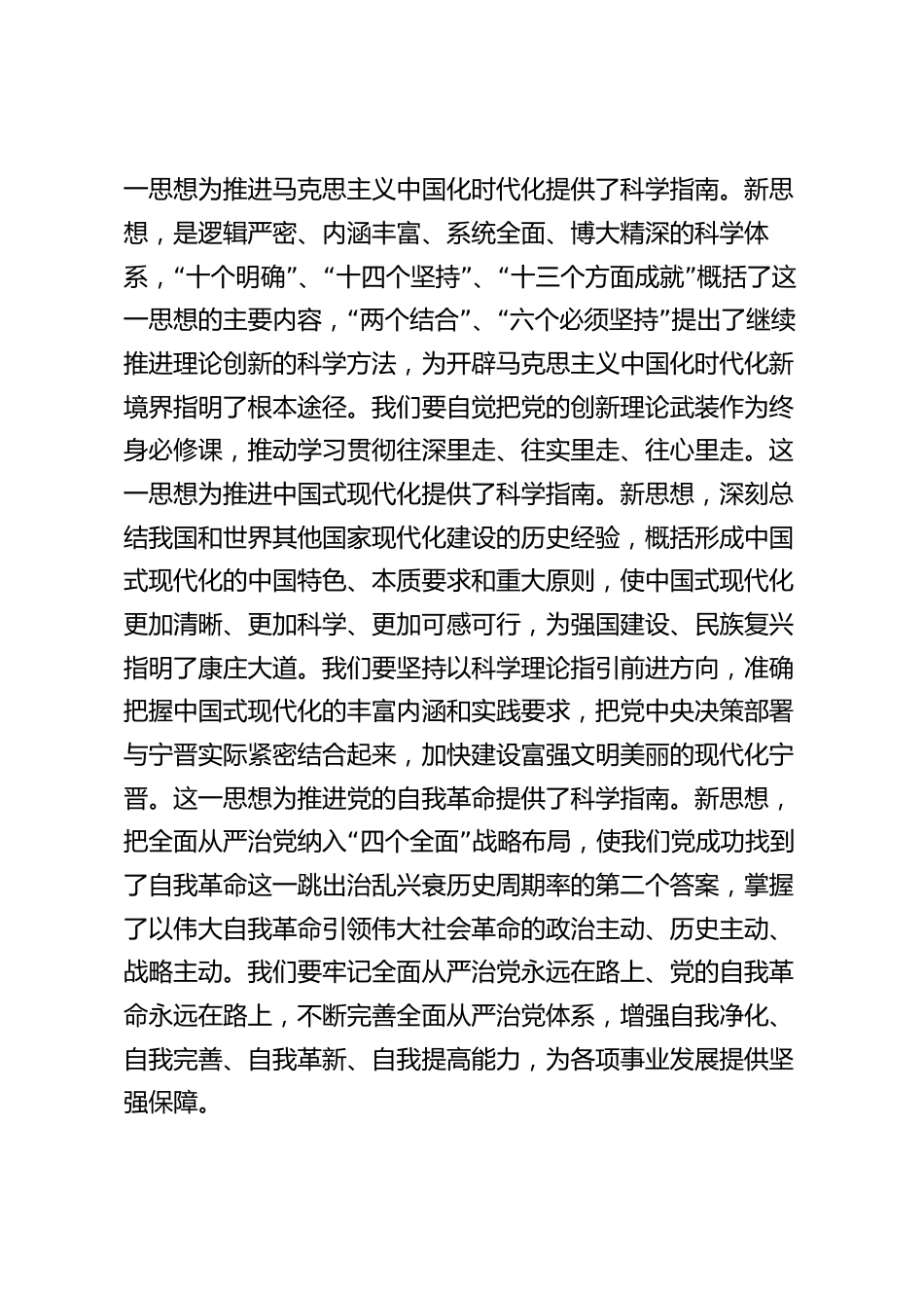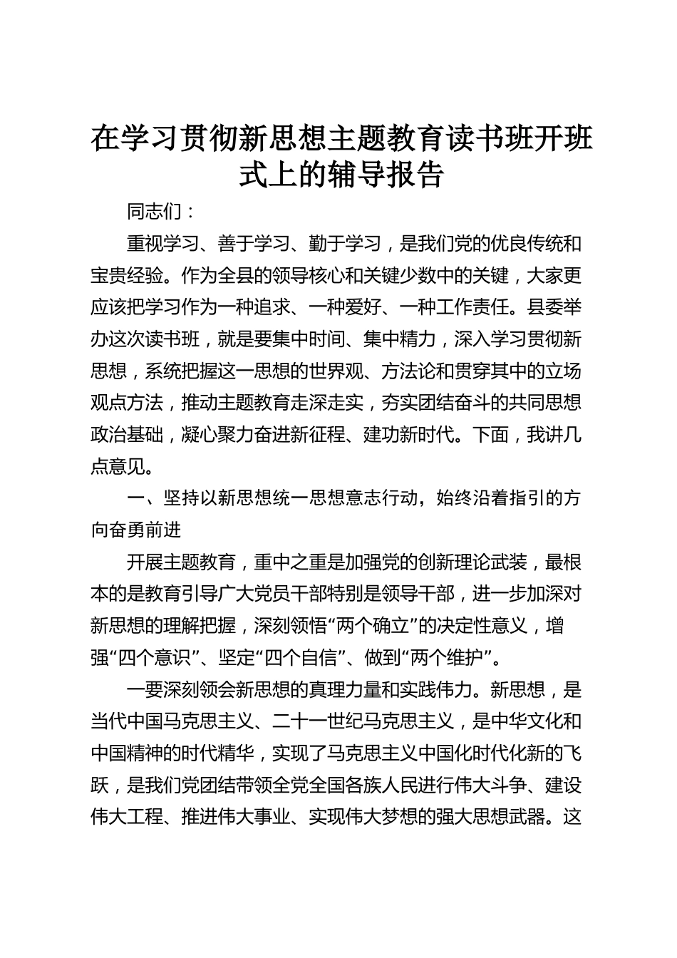 在學(xué)習(xí)貫徹新思想主題教育讀書班開班式上的輔導(dǎo)報告同志們:重視學(xué)習(xí)、善于學(xué)習(xí)、勤于學(xué)習(xí),是我們黨的優(yōu)良傳統(tǒng)和寶貴經(jīng)驗。作為全縣的領(lǐng)導(dǎo)核心和關(guān)鍵少數(shù)中的關(guān)鍵,大家更應(yīng)該把學(xué)習(xí)作為一種追求、一種愛好、一種工作責(zé)任??h委舉辦這次讀書班,就是要集中時間、集中精力,深入學(xué)習(xí)貫徹新思想,系統(tǒng)把握這一思想的世界觀、方法論和貫穿其中的立場觀點方法,推動主題教育走深走實,夯實團(tuán)結(jié)奮斗的共同思想政治基礎(chǔ),凝心聚力奮進(jìn)新征程、建功新時代。下面,我講幾點意見。一、堅持以新思想統(tǒng)一思想意志行動,始終沿著指引的方向奮勇前進(jìn)開展主題教育,重中之重是加強黨的...