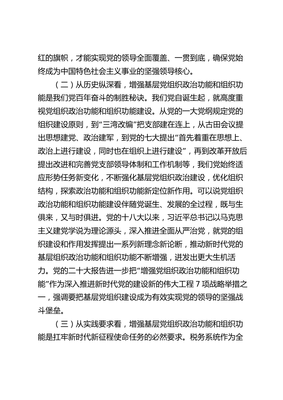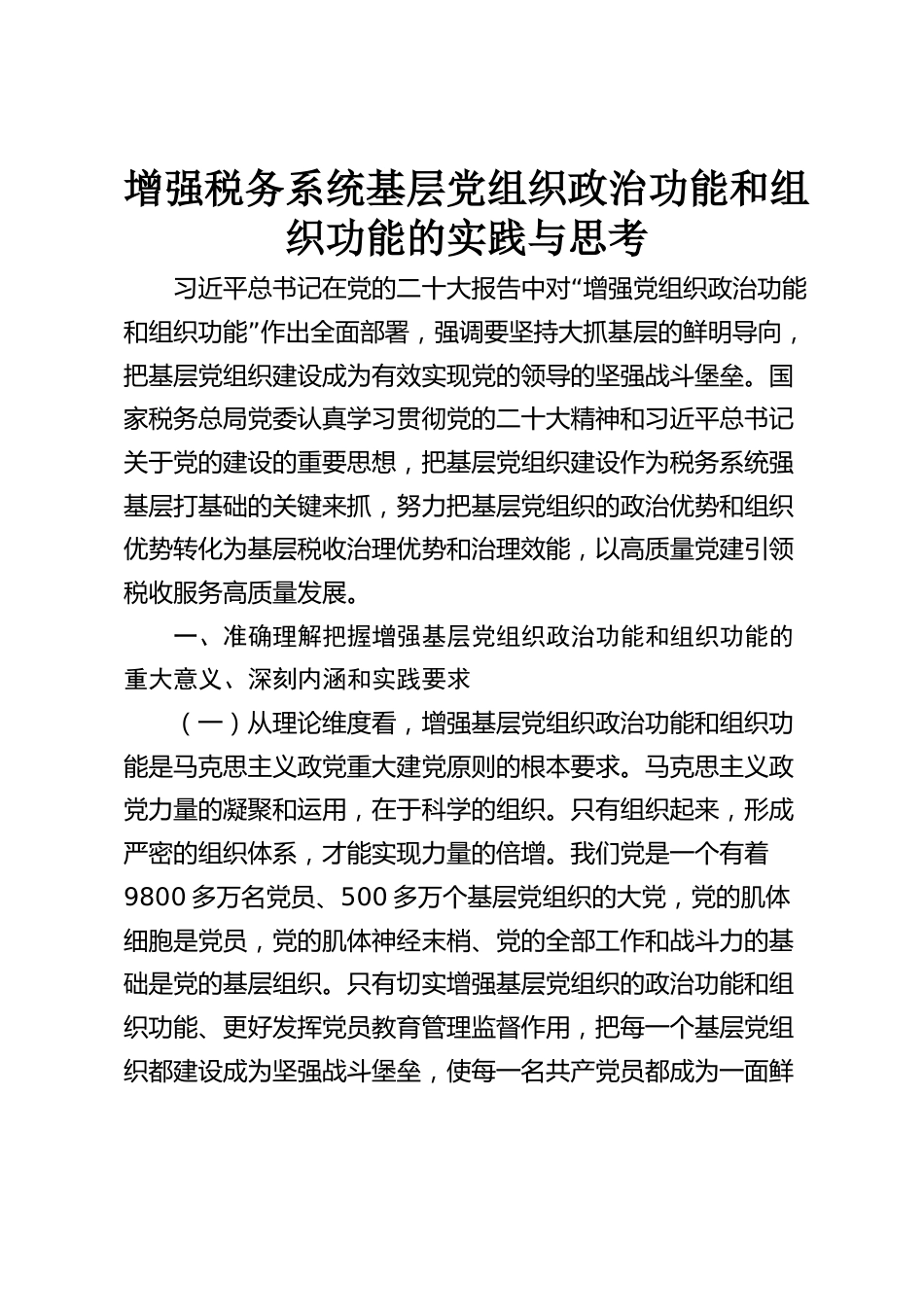 增強稅務系統(tǒng)基層黨組織政治功能和組織功能的實踐與思考“習近平總書記在黨的二十大報告中對增強黨組織政治功能”和組織功能作出全面部署,強調(diào)要堅持大抓基層的鮮明導向,把基層黨組織建設成為有效實現(xiàn)黨的領導的堅強戰(zhàn)斗堡壘。國家稅務總局黨委認真學習貫徹黨的二十大精神和習近平總書記關于黨的建設的重要思想,把基層黨組織建設作為稅務系統(tǒng)強基層打基礎的關鍵來抓,努力把基層黨組織的政治優(yōu)勢和組織優(yōu)勢轉(zhuǎn)化為基層稅收治理優(yōu)勢和治理效能,以高質(zhì)量黨建引領稅收服務高質(zhì)量發(fā)展。一、準確理解把握增強基層黨組織政治功能和組織功能的重大意義、深刻內(nèi)涵和實踐要求(...