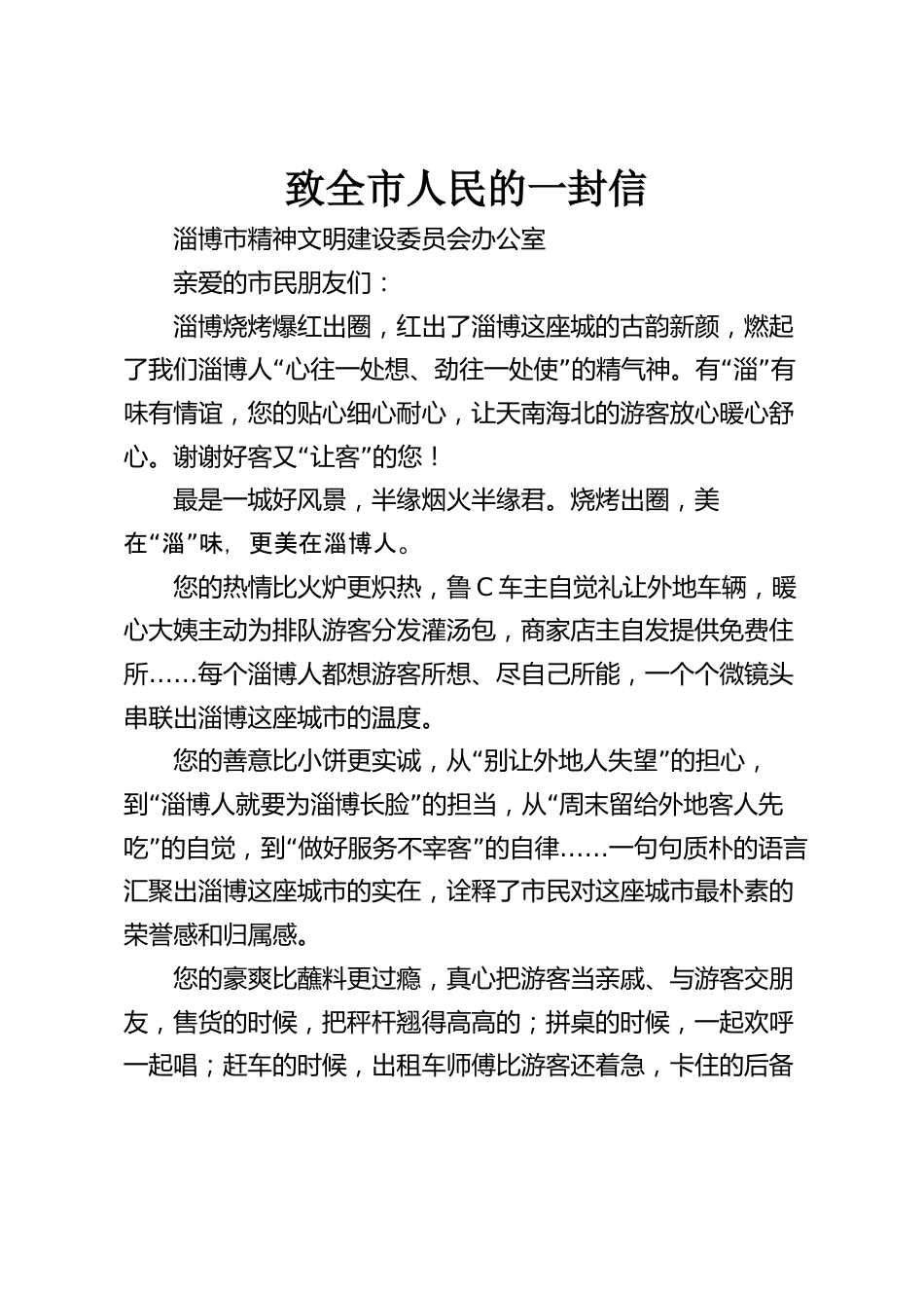 致全市人民的一封信淄博市精神文明建設(shè)委員會(huì)辦公室親愛的市民朋友們:淄博燒烤爆紅出圈,紅出了淄博這座城的古韻新顏,燃起“”“”了我們淄博人心往一處想、勁往一處使的精氣神。有淄有味有情誼,您的貼心細(xì)心耐心,讓天南海北的游客放心暖心舒“”心。謝謝好客又讓客的您!最是一城好風(fēng)景,半緣煙火半緣君。燒烤出圈,美“”在淄味,更美在淄博人。您的熱情比火爐更熾熱,魯C車主自覺禮讓外地車輛,暖心大姨主動(dòng)為排隊(duì)游客分發(fā)灌湯包,商家店主自發(fā)提供免費(fèi)住所……每個(gè)淄博人都想游客所想、盡自己所能,一個(gè)個(gè)微鏡頭串聯(lián)出淄博這座城市的溫度。“”您的善意比小餅更...