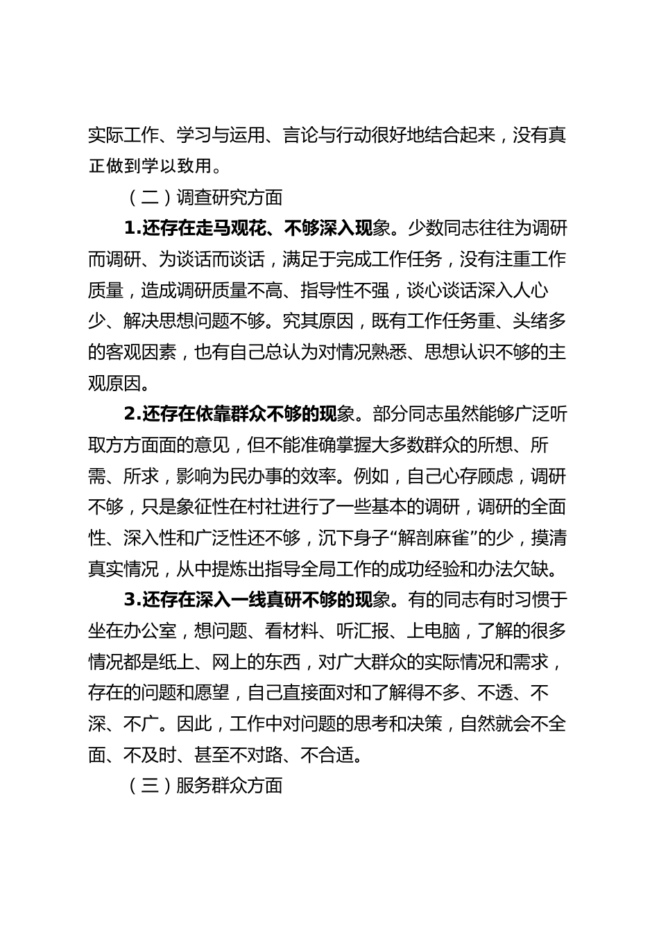 主題教育對照檢查(六個方面問題,7條整改措施)根據(jù)本次主題教育工作要求,通過認真學(xué)習(xí),深入廣泛征求意見建議,和班子成員交流思想、交換意見?,F(xiàn)對照檢查如下:一、存在問題(一)理論學(xué)習(xí)方面1.學(xué)習(xí)認識有偏差。部分干部認為自己本科畢業(yè),平時都“能自學(xué),覺得單位組織集中學(xué)習(xí)是多此一舉,一些干部受經(jīng)濟”工作是硬任務(wù),理論學(xué)習(xí)是軟任務(wù)思想的影響,認為只要任務(wù)完成了,經(jīng)濟發(fā)展了,經(jīng)濟效益好了,學(xué)不學(xué)都無所謂,不愿坐下來或無暇靜下來學(xué)理論。2.理論學(xué)習(xí)不主動,自覺性不高。部分同志往往以近期工作任務(wù)比較重或工作頭緒多忙于事務(wù)工作為理由,不能自覺主...