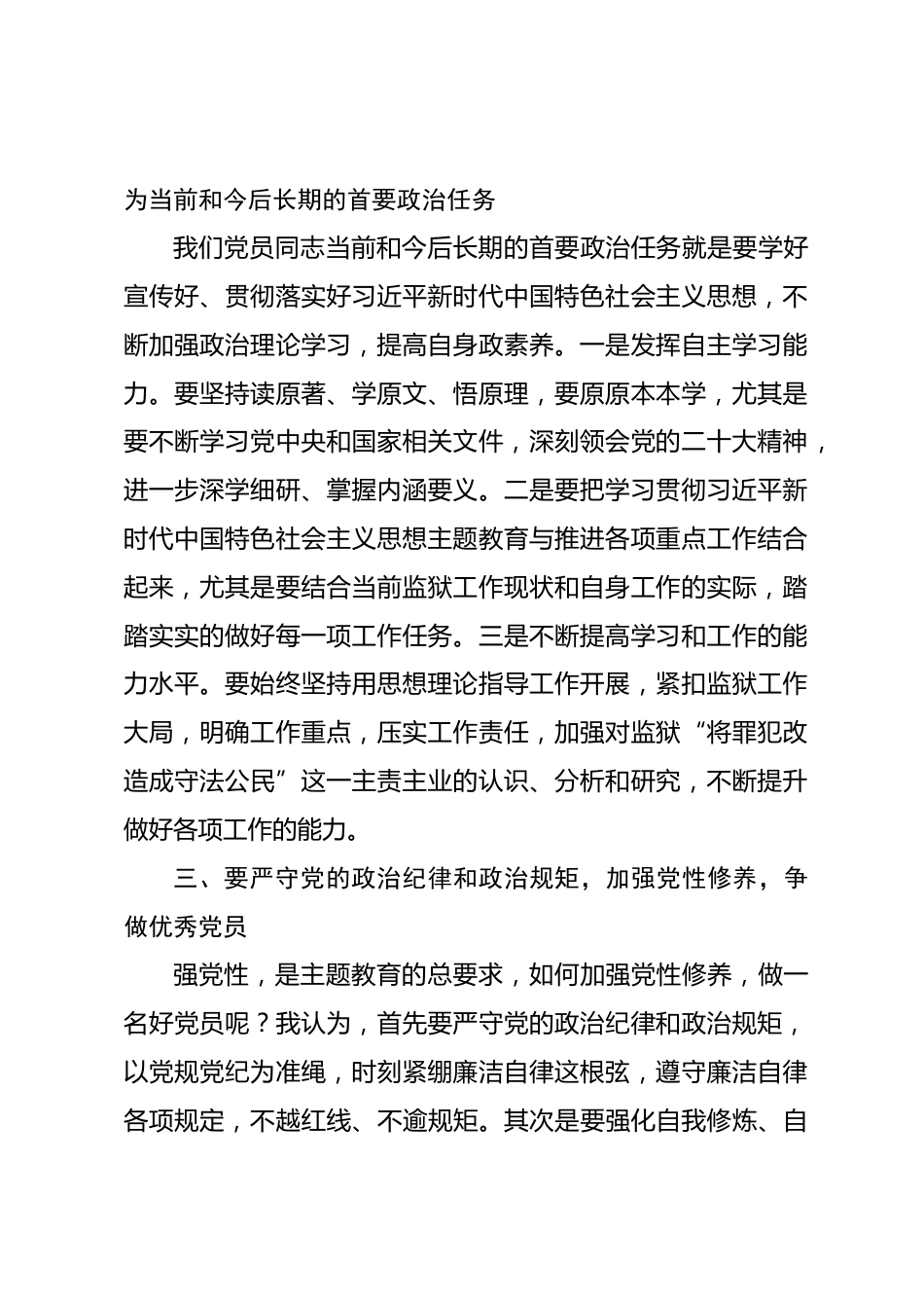 (3篇)監(jiān)獄警察主題教育學習研討心得體會匯編目錄1.監(jiān)獄警察主題教育學習研討心得體會22.監(jiān)獄警察主題教育學習研討心得體會53.監(jiān)獄警察主題教育學習研討心得體會7監(jiān)獄警察主題教育學習研討心得體會通過學習,使我從思想上和精神上受到一次深刻的洗禮,為我今后工作和努力指明了方向,讓自己在政治理論學習上有了收獲,進一步堅定理想信念,黨性得到鍛煉?,F(xiàn)就學習情況談談自己的幾點認識和體會。一、要切實提高政治站位,深刻領會主題教育的重大意義作為黨員首先要按“學思想、強黨性、重實踐、建新功”主題教育的總要求,全面學習、全面把握、全面落實黨的二十大精神,...