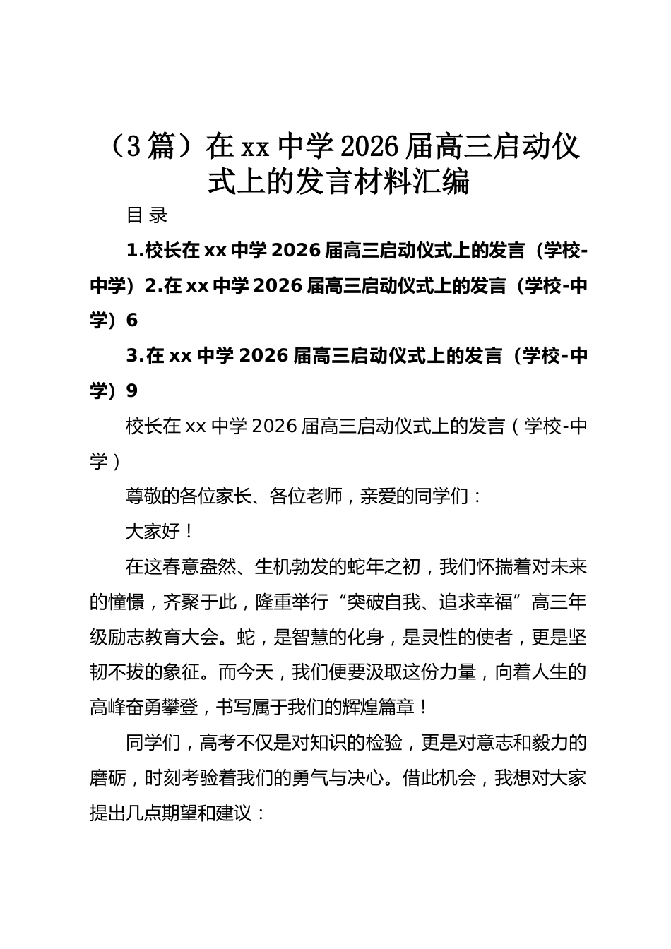 (3篇)在xx中學(xué)2026屆高三啟動儀式上的發(fā)言材料匯編目錄1.校長在xx中學(xué)2026屆高三啟動儀式上的發(fā)言(學(xué)校-中學(xué))2.在xx中學(xué)2026屆高三啟動儀式上的發(fā)言(學(xué)校-中學(xué))63.在xx中學(xué)2026屆高三啟動儀式上的發(fā)言(學(xué)校-中學(xué))9校長在xx中學(xué)2026屆高三啟動儀式上的發(fā)言(學(xué)校-中學(xué))尊敬的各位家長、各位老師,親愛的同學(xué)們:大家好!在這春意盎然、生機勃發(fā)的蛇年之初,我們懷揣著對未來的憧憬,齊聚于此,隆重舉行“突破自我、追求幸?!备呷昙墑钪窘逃髸?。蛇,是智慧的化身,是靈性的使者,更是堅韌不拔的象征。而今天,我們便要汲取這份力量,向著人生的高峰奮勇攀登...