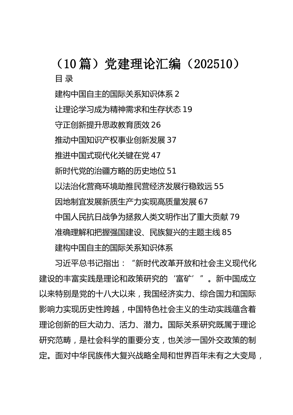 (10篇)黨建理論匯編(202510)目錄建構(gòu)中國自主的國際關(guān)系知識(shí)體系2讓理論學(xué)習(xí)成為精神需求和生存狀態(tài)19守正創(chuàng)新提升思政教育質(zhì)效26推動(dòng)中國知識(shí)產(chǎn)權(quán)事業(yè)創(chuàng)新發(fā)展37推進(jìn)中國式現(xiàn)代化關(guān)鍵在黨47新時(shí)代黨的治疆方略的歷史地位51以法治化營商環(huán)境助推民營經(jīng)濟(jì)發(fā)展行穩(wěn)致遠(yuǎn)55因地制宜發(fā)展新質(zhì)生產(chǎn)力實(shí)現(xiàn)高質(zhì)量發(fā)展67中國人民抗日戰(zhàn)爭為拯救人類文明作出了重大貢獻(xiàn)79準(zhǔn)確理解和把握強(qiáng)國建設(shè)、民族復(fù)興的主題主線85建構(gòu)中國自主的國際關(guān)系知識(shí)體系習(xí)近平總書記指出:“新時(shí)代改革開放和社會(huì)主義現(xiàn)代化建設(shè)的豐富實(shí)踐是理論和政策研究的‘富礦’”。新中國成立以來特別是黨的...