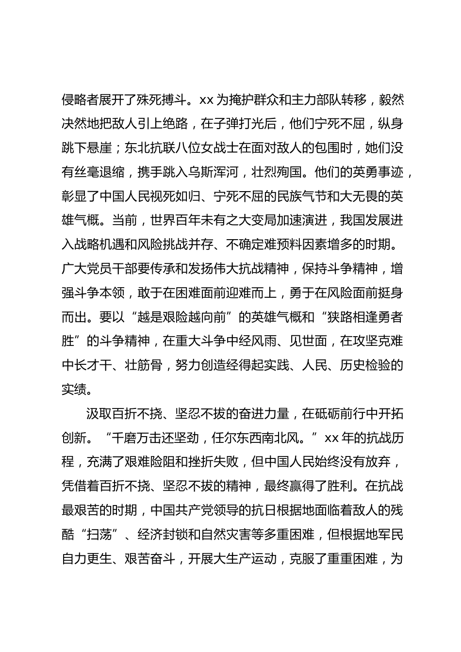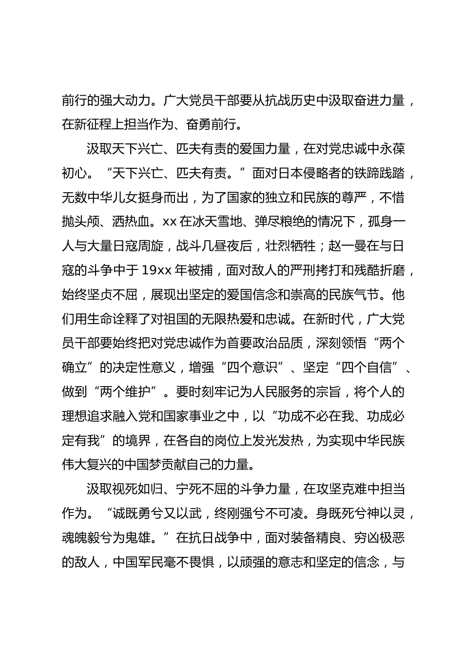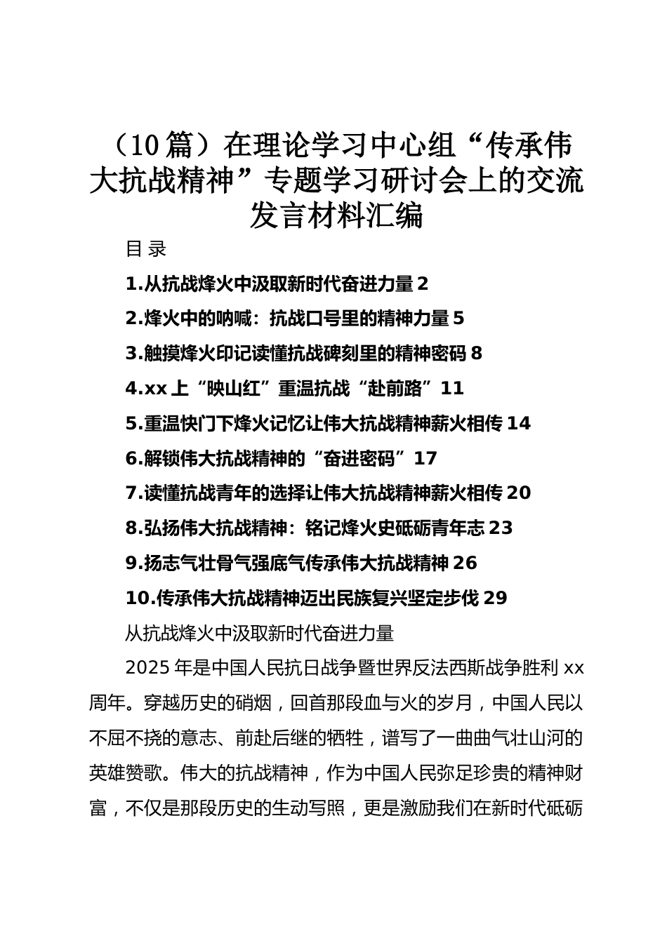 (10篇)在理論學(xué)習(xí)中心組“傳承偉大抗戰(zhàn)精神”專題學(xué)習(xí)研討會(huì)上的交流發(fā)言材料匯編目錄1.從抗戰(zhàn)烽火中汲取新時(shí)代奮進(jìn)力量22.烽火中的吶喊:抗戰(zhàn)口號(hào)里的精神力量53.觸摸烽火印記讀懂抗戰(zhàn)碑刻里的精神密碼84.xx上“映山紅”重溫抗戰(zhàn)“赴前路”115.重溫快門下烽火記憶讓偉大抗戰(zhàn)精神薪火相傳146.解鎖偉大抗戰(zhàn)精神的“奮進(jìn)密碼”177.讀懂抗戰(zhàn)青年的選擇讓偉大抗戰(zhàn)精神薪火相傳208.弘揚(yáng)偉大抗戰(zhàn)精神:銘記烽火史砥礪青年志239.揚(yáng)志氣壯骨氣強(qiáng)底氣傳承偉大抗戰(zhàn)精神2610.傳承偉大抗戰(zhàn)精神邁出民族復(fù)興堅(jiān)定步伐29從抗戰(zhàn)烽火中汲取新時(shí)代奮進(jìn)力量2025年是中國(guó)人民抗日戰(zhàn)爭(zhēng)暨世界...