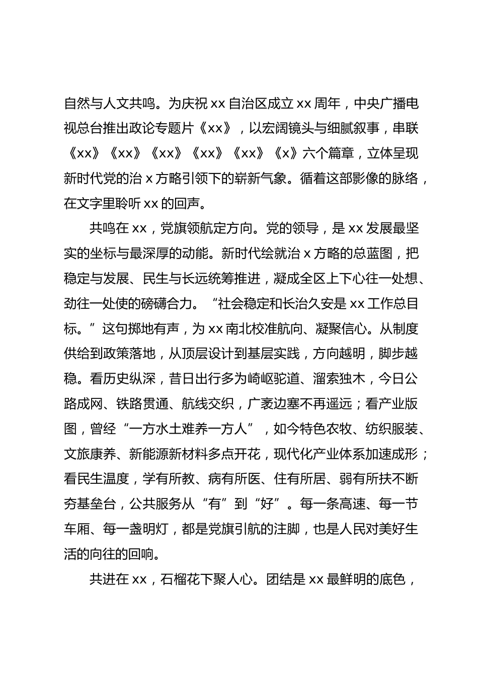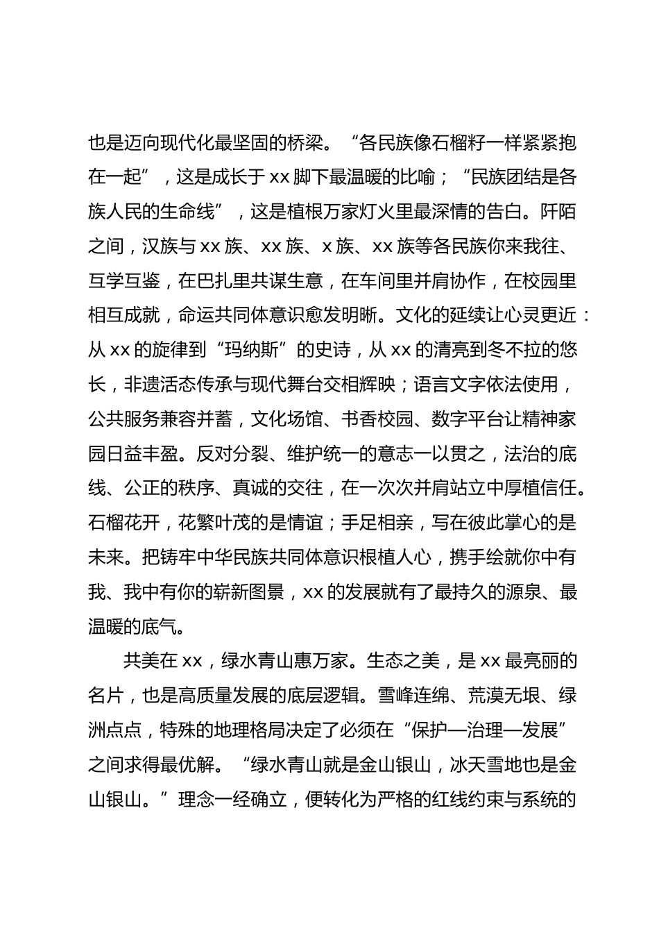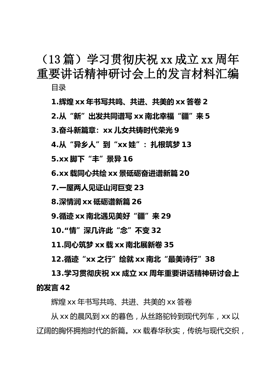 (13篇)學(xué)習(xí)貫徹慶祝xx成立xx周年重要講話精神研討會(huì)上的發(fā)言材料匯編目錄1.輝煌xx年書(shū)寫共鳴、共進(jìn)、共美的xx答卷22.從“新”出發(fā)共同譜寫xx南北幸?!敖眮?lái)53.奮斗新篇章:xx兒女共鑄時(shí)代榮光94.從“異鄉(xiāng)人”到“xx娃”:扎根筑夢(mèng)135.xx腳下“豐”景異166.xx載同心共繪xx景砥礪奮進(jìn)譜新篇207.一屋兩人見(jiàn)證山河巨變238.深情潤(rùn)xx砥礪譜新篇269.循跡xx南北遇見(jiàn)美好“疆”來(lái)2910.“情”深幾許此“念”不變3211.同心筑夢(mèng)xx載xx南北展新卷3512.循跡“xx之行”繪就xx南北“最美詩(shī)行”3813.學(xué)習(xí)貫徹慶祝xx成立xx周年重要講話精神研討會(huì)上的發(fā)言42輝煌xx年書(shū)寫共鳴、共進(jìn)、共...