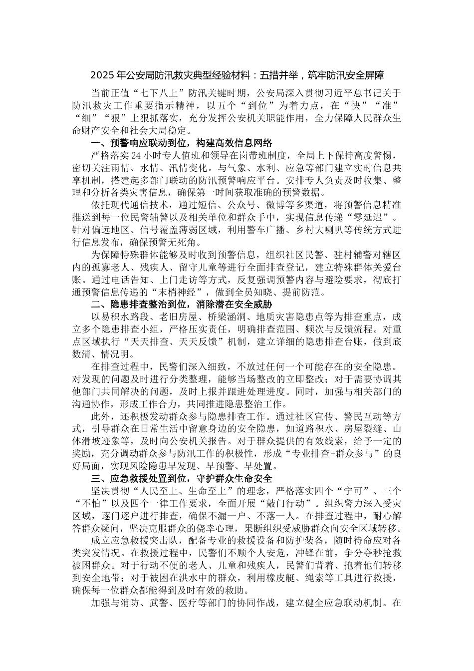 2025年公安局防汛救災(zāi)典型經(jīng)驗材料:五措并舉,筑牢防汛安全屏障