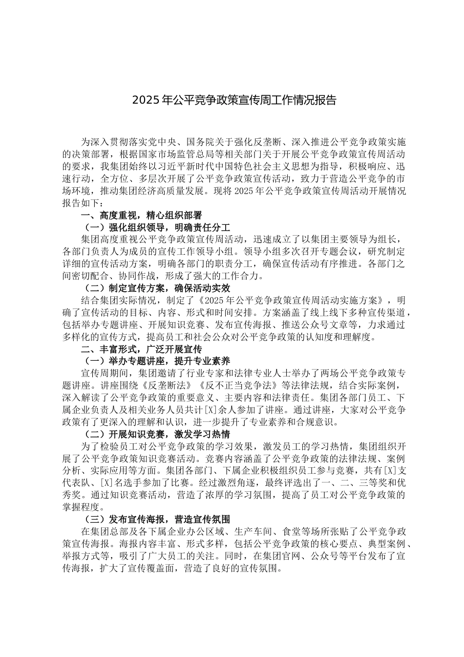 2025年公平競爭政策宣傳周工作情況報告為深入貫徹落實(shí)黨中央、國務(wù)院關(guān)于強(qiáng)化反壟斷、深入推進(jìn)公平競爭政策實(shí)施的決策部署,根據(jù)國家市場監(jiān)管總局等相關(guān)部門關(guān)于開展公平競爭政策宣傳周活動的要求,我集團(tuán)始終以習(xí)近平新時代中國特色社會主義思想為指導(dǎo),積極響應(yīng)、迅速行動,全方位、多層次開展了公平競爭政策宣傳活動,致力于營造公平競爭的市場環(huán)境,推動集團(tuán)經(jīng)濟(jì)高質(zhì)量發(fā)展?,F(xiàn)將2025年公平競爭政策宣傳周活動開展情況報告如下:一、高度重視,精心組織部署(一)強(qiáng)化組織領(lǐng)導(dǎo),明確責(zé)任分工集團(tuán)高度重視公平競爭政策宣傳周活動,迅速成立了以集團(tuán)主要領(lǐng)導(dǎo)為組長,各...