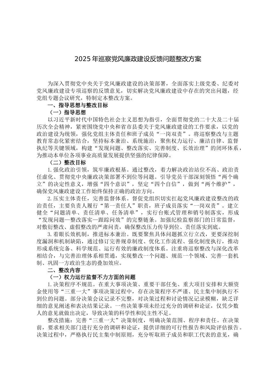 2025年巡察黨風(fēng)廉政建設(shè)反饋問題整改方案為深入貫徹黨中央關(guān)于黨風(fēng)廉政建設(shè)的決策部署,全面落實上級黨委、紀委對黨風(fēng)廉政建設(shè)專項巡察的反饋意見,切實解決黨風(fēng)廉政建設(shè)中存在的突出問題,經(jīng)黨組專題會議研究,特制定本整改方案。一、指導(dǎo)思想與整改目標(一)指導(dǎo)思想以習(xí)近平新時代中國特色社會主義思想為指引,全面貫徹黨的二十大及二十屆歷次全會精神,緊密圍繞黨中央和省市縣委關(guān)于黨風(fēng)廉政建設(shè)的工作要求,以黨的政治建設(shè)為統(tǒng)領(lǐng),強化黨組主體責(zé)任和班子成員“一崗雙責(zé)”。將巡察整改與主題教育常態(tài)化緊密結(jié)合,堅持標本兼治、系統(tǒng)施治,聚焦權(quán)力運行、廉潔自律、...