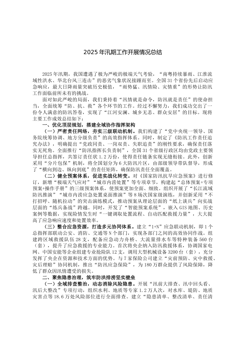 2025年汛期工作開展情況總結(jié)2025年汛期,我國遭遇了極為嚴(yán)峻的極端天氣考驗,“南粵持續(xù)暴雨、江淮流域性洪水、華北臺風(fēng)三連擊”的惡劣氣象狀況接踵而至。全國31個省份先后啟動應(yīng)急響應(yīng),最大日降雨量突破歷史極值,“雨勢猛、汛情險、災(zāi)情重”的形勢讓防汛工作面臨前所未有的挑戰(zhàn)。面對如此嚴(yán)峻的局面,我們秉持著“汛情就是命令,防汛就是責(zé)任”的使命擔(dān)當(dāng),全面統(tǒng)籌“防、抗、救”各個環(huán)節(jié)的工作。經(jīng)過不懈努力,我們成功交出了一份令人滿意的防汛答卷,實現(xiàn)了“江河安瀾、城鄉(xiāng)無恙、群眾安居”的目標(biāo)。現(xiàn)將主要工作成效總結(jié)如下:一、優(yōu)化頂層規(guī)劃,搭建全域協(xié)作指揮...