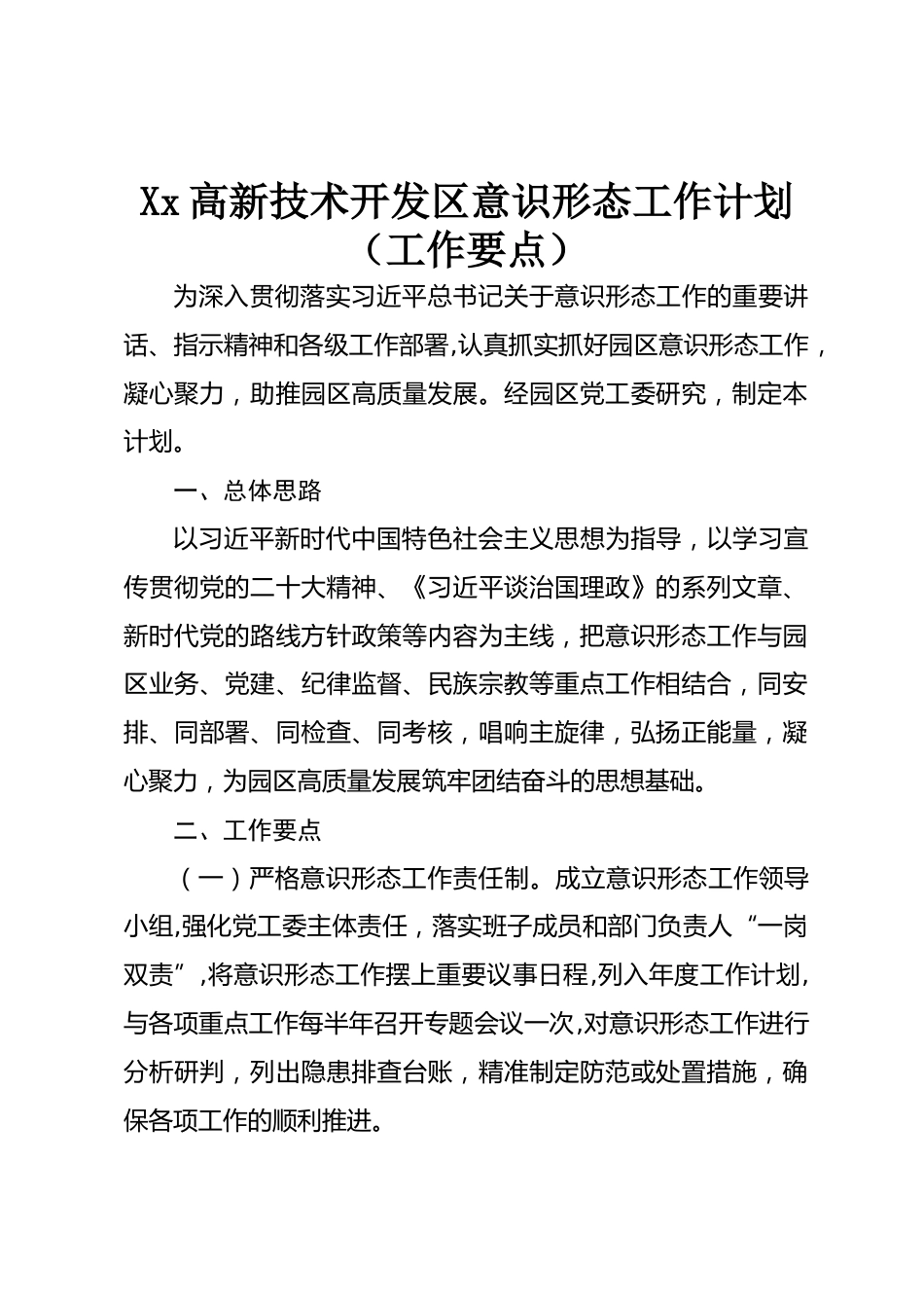 Xx高新技術(shù)開發(fā)區(qū)意識形態(tài)工作計劃(工作要點)為深入貫徹落實習近平總書記關(guān)于意識形態(tài)工作的重要講話、指示精神和各級工作部署,認真抓實抓好園區(qū)意識形態(tài)工作,凝心聚力,助推園區(qū)高質(zhì)量發(fā)展。經(jīng)園區(qū)黨工委研究,制定本計劃。一、總體思路以習近平新時代中國特色社會主義思想為指導,以學習宣傳貫徹黨的二十大精神、《習近平談治國理政》的系列文章、新時代黨的路線方針政策等內(nèi)容為主線,把意識形態(tài)工作與園區(qū)業(yè)務、黨建、紀律監(jiān)督、民族宗教等重點工作相結(jié)合,同安排、同部署、同檢查、同考核,唱響主旋律,弘揚正能量,凝心聚力,為園區(qū)高質(zhì)量發(fā)展筑牢團結(jié)奮斗的思...