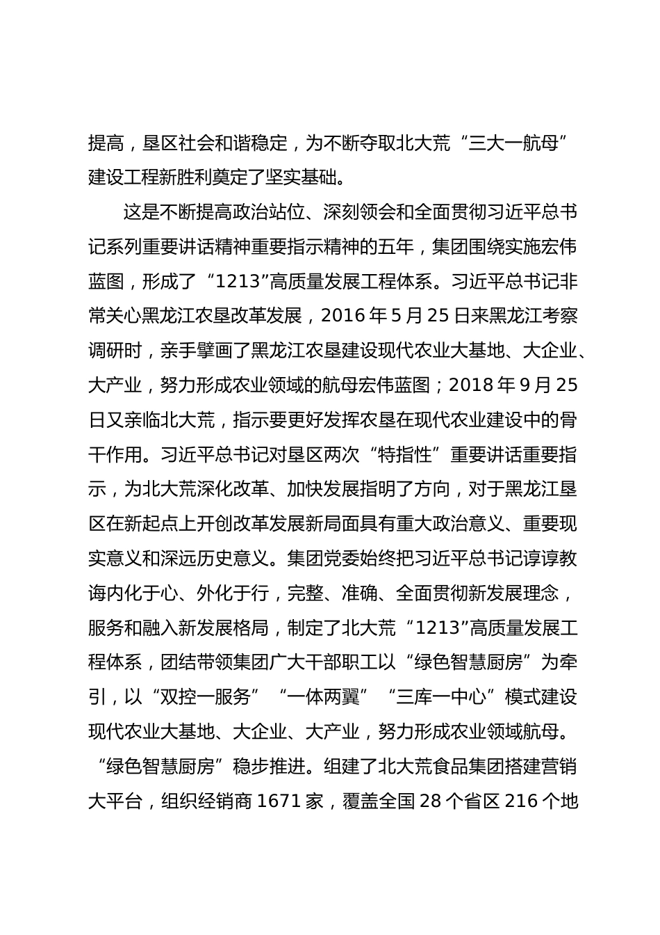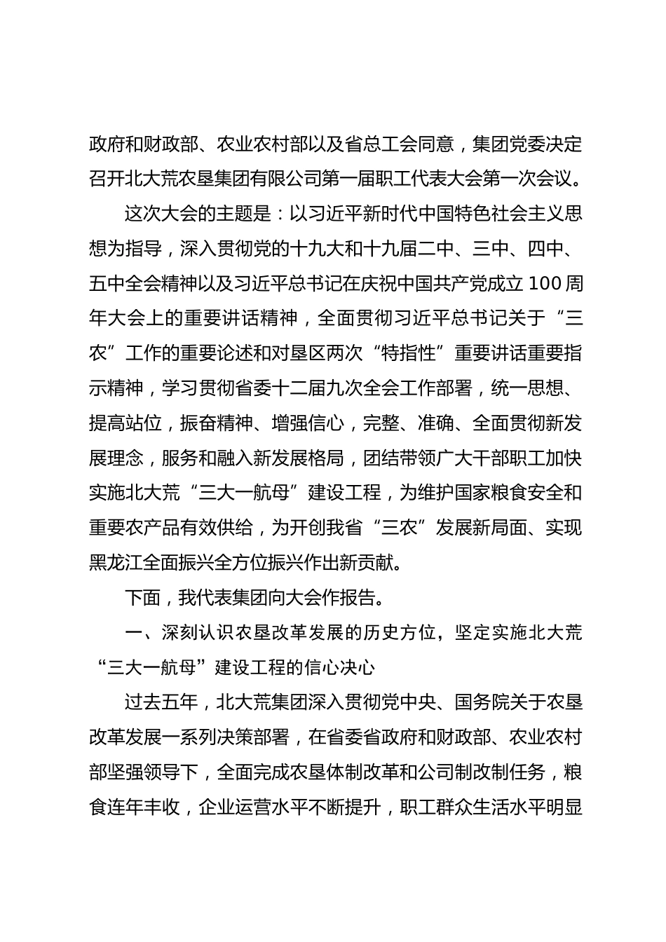 Xx集團(tuán)有限公司第一屆職工代表大會(huì)第一次會(huì)議上的報(bào)告——深入貫徹新發(fā)展理念服務(wù)和融入新發(fā)展格局為不斷奪取北大荒“三大一航母”建設(shè)工程北大荒農(nóng)墾集團(tuán)有限公司黨委書(shū)記、董事長(zhǎng)各位代表,同志們:7月下旬閉幕的省委十二屆九次全會(huì),討論通過(guò)了《關(guān)于深入貫徹新發(fā)展理念加快融入新發(fā)展格局推進(jìn)農(nóng)業(yè)農(nóng)村現(xiàn)代化實(shí)現(xiàn)新突破的決定》,把墾區(qū)的改革發(fā)展納入到全省大局整體部署,明確了墾區(qū)率先實(shí)現(xiàn)農(nóng)業(yè)現(xiàn)代化的發(fā)展目標(biāo),明確了北大荒“三大一航母”建設(shè)工程的主要任務(wù),健全了墾區(qū)融入屬地發(fā)展機(jī)制。這是省委在新的歷史時(shí)期對(duì)北大荒的新定位,賦予北大荒在全省農(nóng)業(yè)農(nóng)村現(xiàn)...