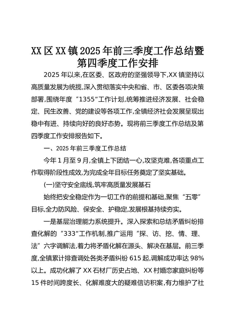 XX區(qū)XX鎮(zhèn)2025年前三季度工作總結(jié)暨第四季度工作安排2025年以來,在區(qū)委、區(qū)政府的堅(jiān)強(qiáng)領(lǐng)導(dǎo)下,XX鎮(zhèn)堅(jiān)持以高質(zhì)量發(fā)展為統(tǒng)攬,深入貫徹落實(shí)中央和省、市、區(qū)委各項(xiàng)決策部署,圍繞年度“1355”工作計(jì)劃,統(tǒng)籌推進(jìn)經(jīng)濟(jì)發(fā)展、社會穩(wěn)定、民生改善、黨的建設(shè)等各項(xiàng)工作,全鎮(zhèn)經(jīng)濟(jì)社會發(fā)展呈現(xiàn)出穩(wěn)中有進(jìn)、持續(xù)向好的良好態(tài)勢?,F(xiàn)將前三季度工作總結(jié)及第四季度工作安排報(bào)告如下。一、2025年前三季度工作總結(jié)今年1月至9月,全鎮(zhèn)上下團(tuán)結(jié)一心,攻堅(jiān)克難,各項(xiàng)重點(diǎn)工作取得階段性成效,為完成全年目標(biāo)任務(wù)奠定了堅(jiān)實(shí)基礎(chǔ)。(一)堅(jiān)守安全底線,筑牢高質(zhì)量發(fā)展基石始終把安全穩(wěn)定作為一切工作的前...