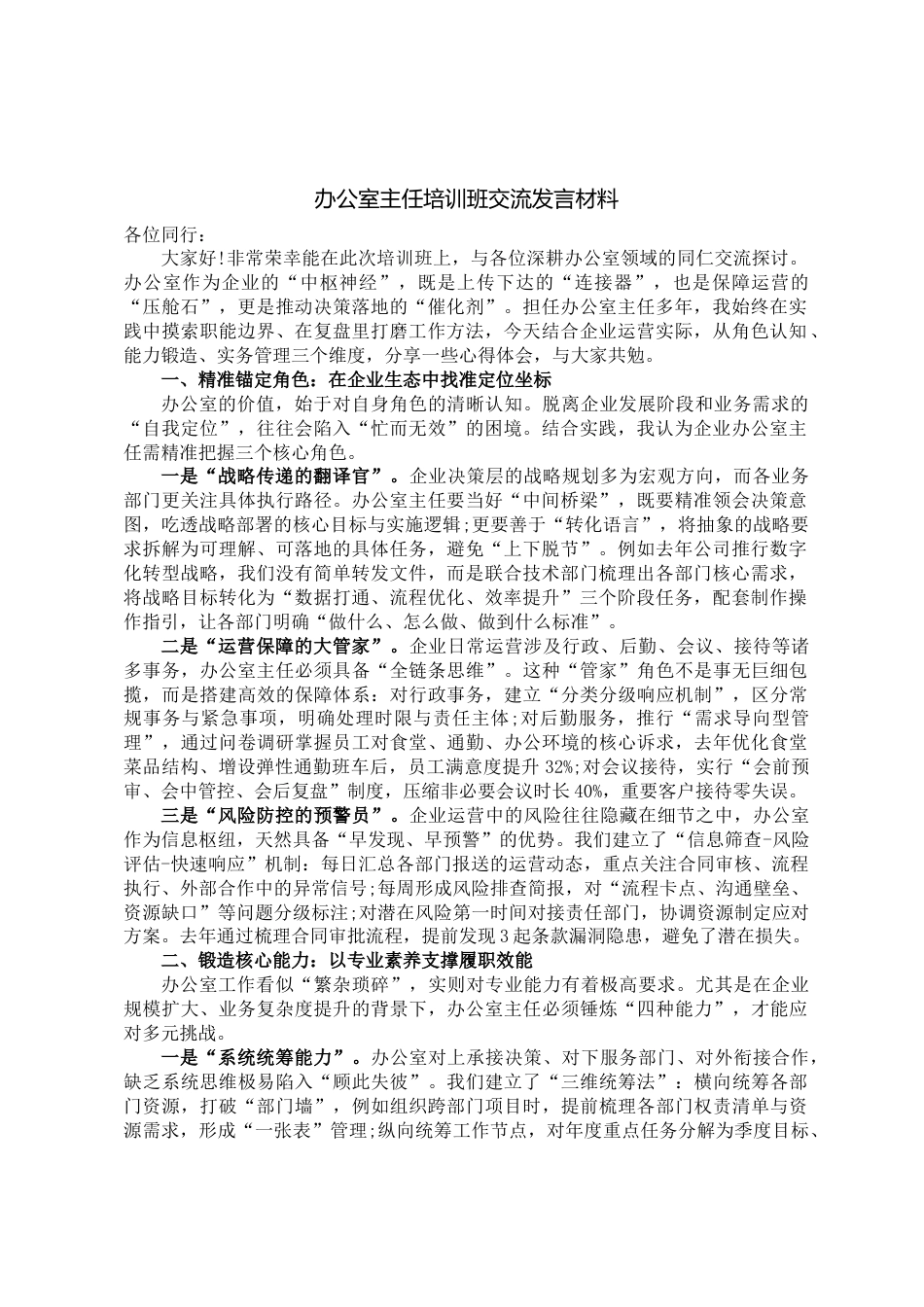 辦公室主任培訓(xùn)班交流發(fā)言材料各位同行:大家好!非常榮幸能在此次培訓(xùn)班上,與各位深耕辦公室領(lǐng)域的同仁交流探討。辦公室作為企業(yè)的“中樞神經(jīng)”,既是上傳下達(dá)的“連接器”,也是保障運營的“壓艙石”,更是推動決策落地的“催化劑”。擔(dān)任辦公室主任多年,我始終在實踐中摸索職能邊界、在復(fù)盤里打磨工作方法,今天結(jié)合企業(yè)運營實際,從角色認(rèn)知、能力鍛造、實務(wù)管理三個維度,分享一些心得體會,與大家共勉。一、精準(zhǔn)錨定角色:在企業(yè)生態(tài)中找準(zhǔn)定位坐標(biāo)辦公室的價值,始于對自身角色的清晰認(rèn)知。脫離企業(yè)發(fā)展階段和業(yè)務(wù)需求的“自我定位”,往往會陷入“忙而無效”的...