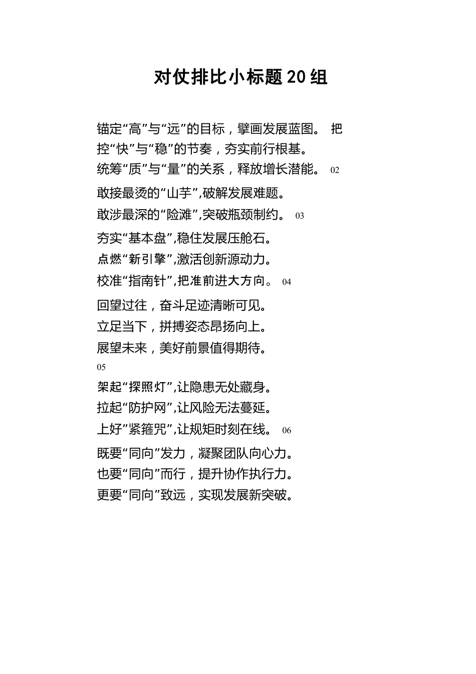 對仗排比小標(biāo)題20組“”“”錨定高與遠(yuǎn)的目標(biāo),擘畫發(fā)展藍(lán)圖。把“”“”控快與穩(wěn)的節(jié)奏,夯實(shí)前行根基?!啊薄啊苯y(tǒng)籌質(zhì)與量的關(guān)系,釋放增長潛能。02“”敢接最燙的山芋,破解發(fā)展難題?!啊备疑孀钌畹碾U(xiǎn)灘,突破瓶頸制約。03“”夯實(shí)基本盤,穩(wěn)住發(fā)展壓艙石?!啊秉c(diǎn)燃新引擎,激活創(chuàng)新源動(dòng)力。“”校準(zhǔn)指南針,把準(zhǔn)前進(jìn)大方向。04回望過往,奮斗足跡清晰可見。立足當(dāng)下,拼搏姿態(tài)昂揚(yáng)向上。展望未來,美好前景值得期待。05“”架起探照燈,讓隱患無處藏身?!啊崩鸱雷o(hù)網(wǎng),讓風(fēng)險(xiǎn)無法蔓延?!薄鄙虾镁o箍咒,讓規(guī)矩時(shí)刻在線。06“”既要同向發(fā)力,凝聚團(tuán)隊(duì)向心力?!啊币惨?..