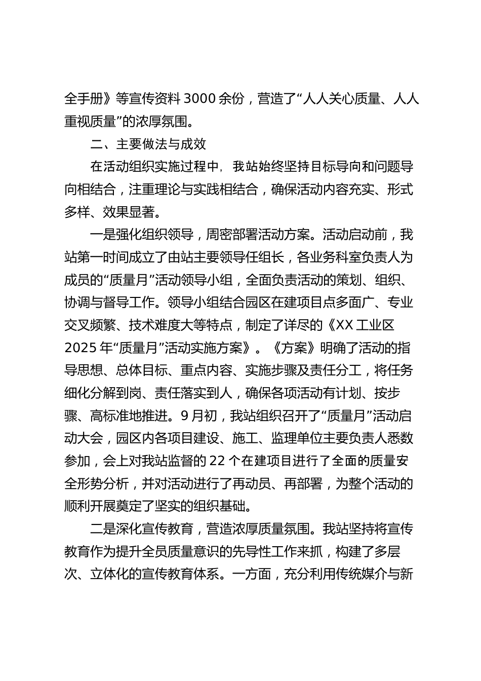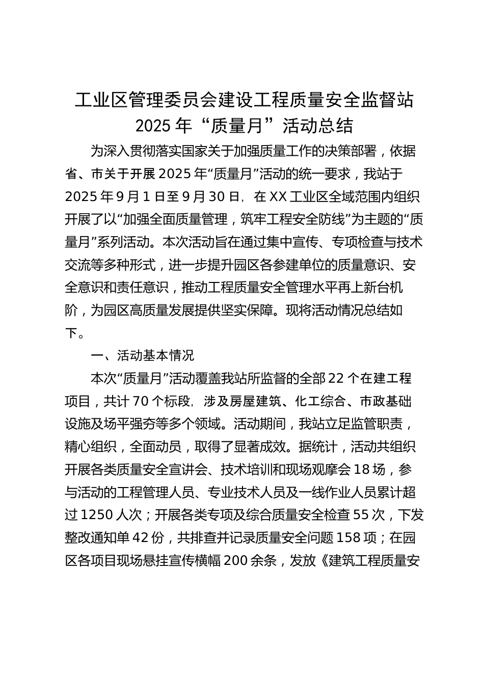 工業(yè)區(qū)管理委員會建設工程質量安全監(jiān)督站2025年“質量月”活動總結為深入貫徹落實國家關于加強質量工作的決策部署,依據省、市關于開展2025“”年質量月活動的統(tǒng)一要求,我站于2025年9月1日至9月30日,在XX工業(yè)區(qū)全域范圍內組織“”“開展了以加強全面質量管理,筑牢工程安全防線為主題的質”量月系列活動。本次活動旨在通過集中宣傳、專項檢查與技術交流等多種形式,進一步提升園區(qū)各參建單位的質量意識、安全意識和責任意識,推動工程質量安全管理水平再上新臺機階,為園區(qū)高質量發(fā)展提供堅實保障?,F將活動情況總結如下。一、活動基本情況“”本次質量月活動覆蓋我站...