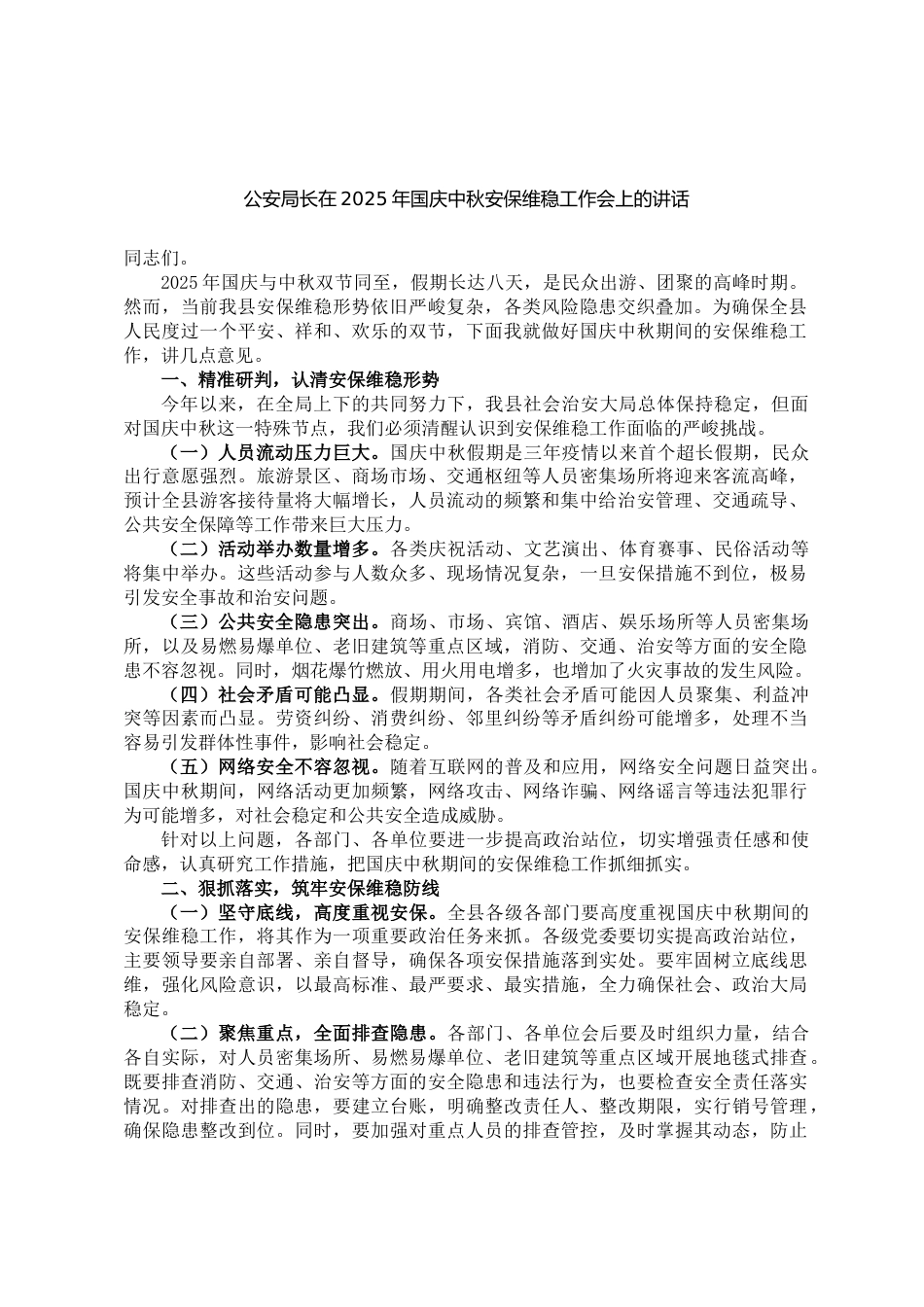公安局長在2025年國慶中秋安保維穩(wěn)工作會上的講話同志們。2025年國慶與中秋雙節(jié)同至,假期長達八天,是民眾出游、團聚的高峰時期。然而,當(dāng)前我縣安保維穩(wěn)形勢依舊嚴峻復(fù)雜,各類風(fēng)險隱患交織疊加。為確保全縣人民度過一個平安、祥和、歡樂的雙節(jié),下面我就做好國慶中秋期間的安保維穩(wěn)工作,講幾點意見。一、精準(zhǔn)研判,認清安保維穩(wěn)形勢今年以來,在全局上下的共同努力下,我縣社會治安大局總體保持穩(wěn)定,但面對國慶中秋這一特殊節(jié)點,我們必須清醒認識到安保維穩(wěn)工作面臨的嚴峻挑戰(zhàn)。(一)人員流動壓力巨大。國慶中秋假期是三年疫情以來首個超長假期,民眾出行意愿強烈...