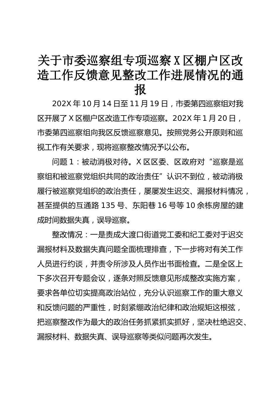 關(guān)于市委巡察組專項(xiàng)巡察X區(qū)棚戶區(qū)改造工作反饋意見(jiàn)整改工作進(jìn)展情況的通報(bào)