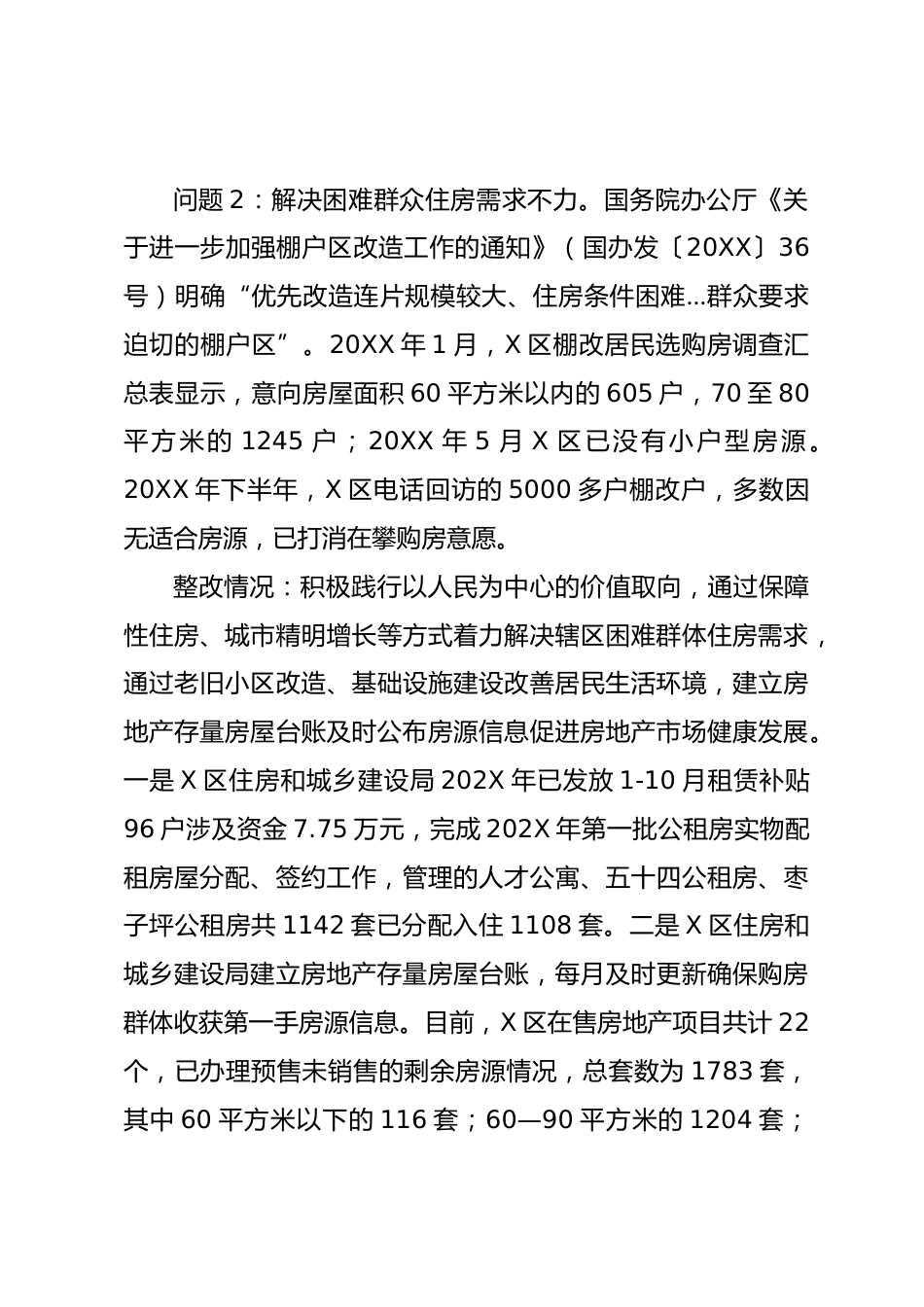 關(guān)于市委巡察組專項(xiàng)巡察X區(qū)棚戶區(qū)改造工作反饋意見(jiàn)整改工作進(jìn)展情況的通報(bào)202X年10月14日至11月19日,市委第四巡察組對(duì)我區(qū)開(kāi)展了X區(qū)棚戶區(qū)改造工作專項(xiàng)巡察。202X年1月20日,市委第四巡察組向我區(qū)反饋巡察意見(jiàn)。按照黨務(wù)公開(kāi)原則和巡視工作有關(guān)要求,現(xiàn)將巡察整改情況予以公布。問(wèn)題1:被動(dòng)消極對(duì)待。X區(qū)區(qū)委、區(qū)政府對(duì)“巡察是巡察組和被巡察黨組織共同的政治責(zé)任”認(rèn)識(shí)不到位,被動(dòng)消極履行被巡察黨組織的政治責(zé)任,屢屢發(fā)生遲交、漏報(bào)材料情況,甚至提供的互通路135號(hào)、東陽(yáng)巷16號(hào)等10余棟房屋的建成時(shí)間數(shù)據(jù)失真,誤導(dǎo)巡察。整改情況:一是責(zé)成大渡口街道黨工委和紀(jì)...