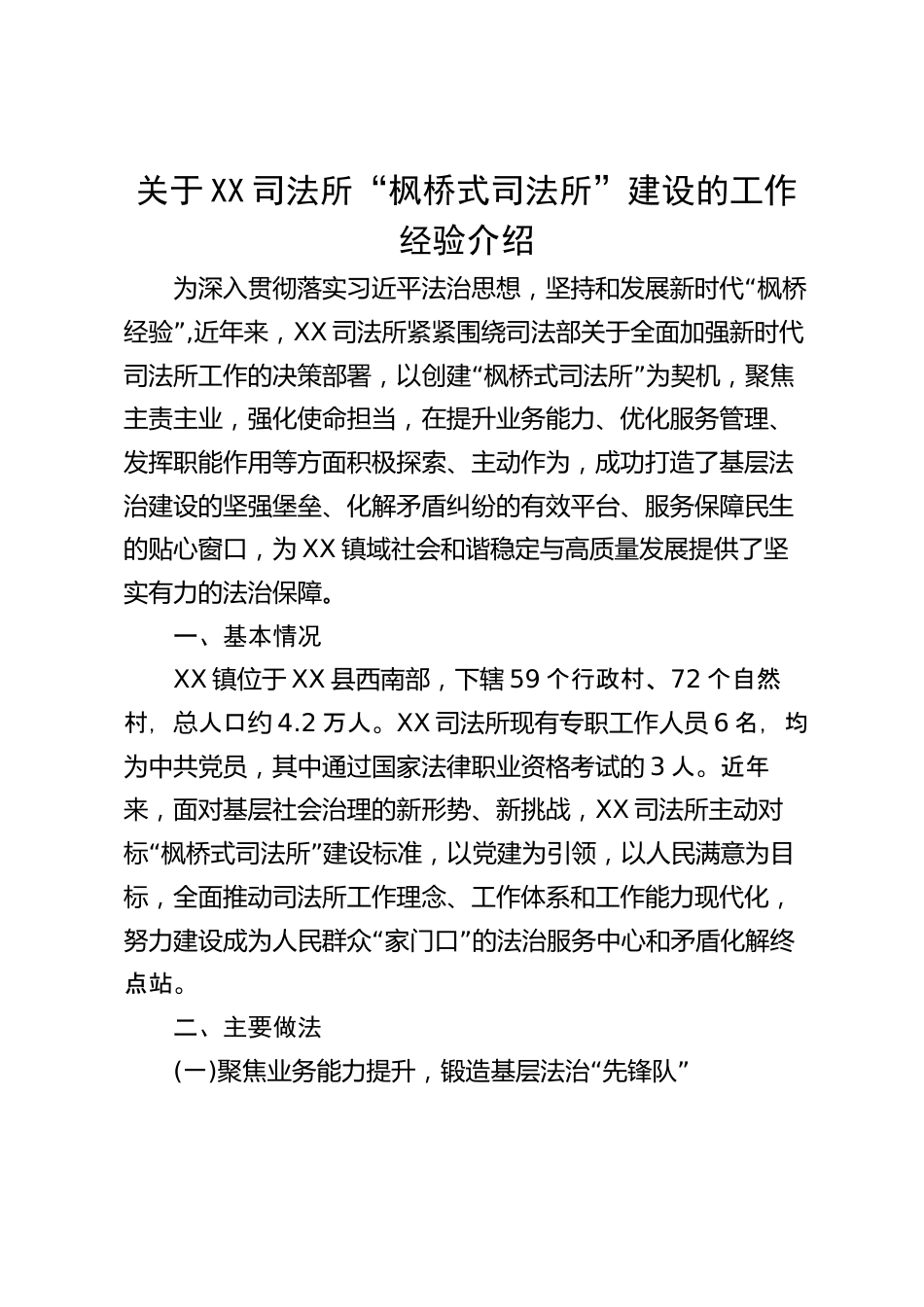 關(guān)于XX司法所“楓橋式司法所”建設(shè)的工作經(jīng)驗(yàn)介紹“為深入貫徹落實(shí)習(xí)近平法治思想,堅(jiān)持和發(fā)展新時(shí)代楓橋”經(jīng)驗(yàn),近年來,XX司法所緊緊圍繞司法部關(guān)于全面加強(qiáng)新時(shí)代“”司法所工作的決策部署,以創(chuàng)建楓橋式司法所為契機(jī),聚焦主責(zé)主業(yè),強(qiáng)化使命擔(dān)當(dāng),在提升業(yè)務(wù)能力、優(yōu)化服務(wù)管理、發(fā)揮職能作用等方面積極探索、主動(dòng)作為,成功打造了基層法治建設(shè)的堅(jiān)強(qiáng)堡壘、化解矛盾糾紛的有效平臺(tái)、服務(wù)保障民生的貼心窗口,為XX鎮(zhèn)域社會(huì)和諧穩(wěn)定與高質(zhì)量發(fā)展提供了堅(jiān)實(shí)有力的法治保障。一、基本情況XX鎮(zhèn)位于XX縣西南部,下轄59個(gè)行政村、72個(gè)自然村,總?cè)丝诩s4.2萬人。XX司法所現(xiàn)有...