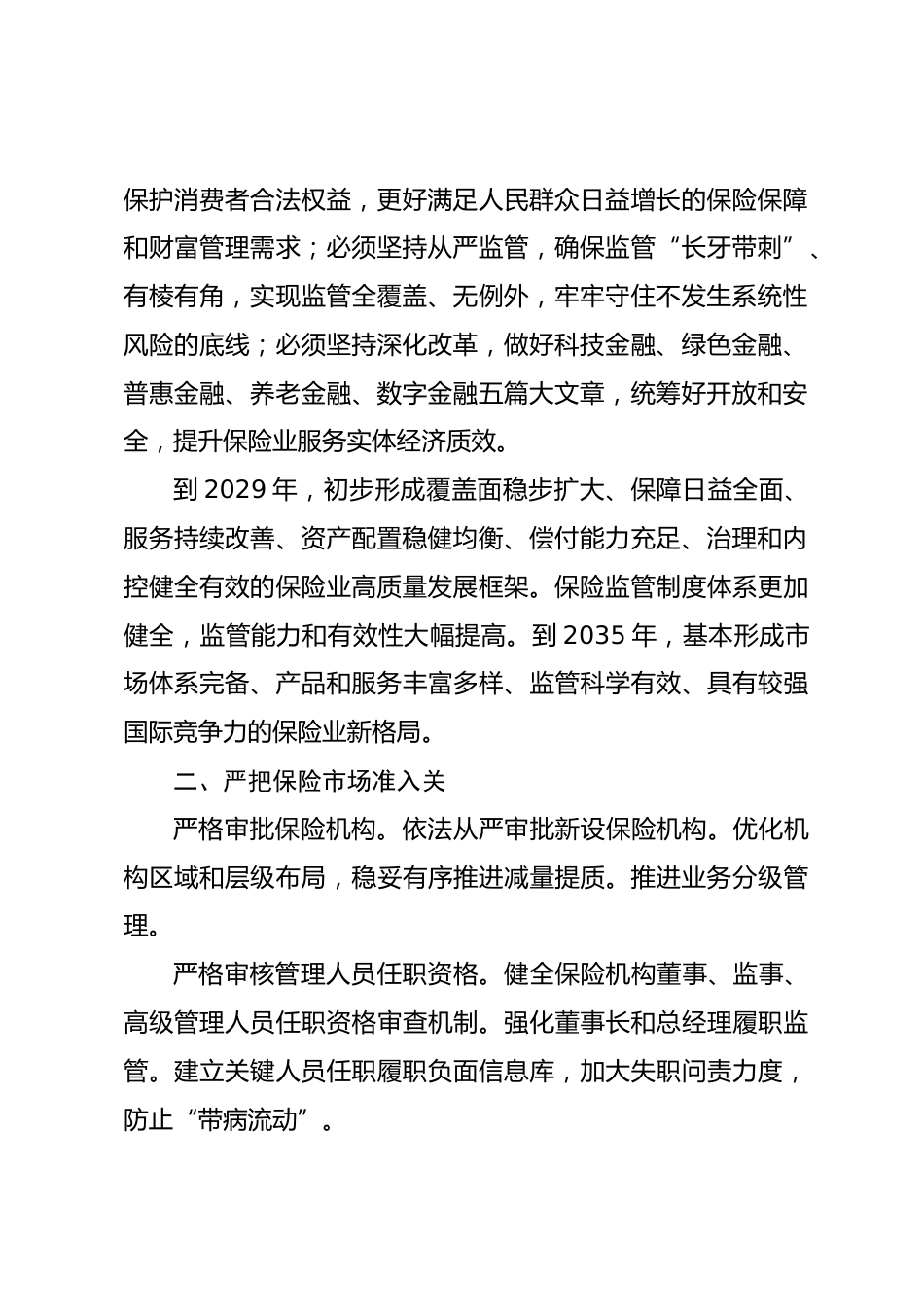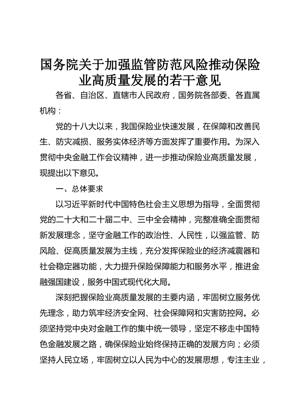 國(guó)務(wù)院關(guān)于加強(qiáng)監(jiān)管防范風(fēng)險(xiǎn)推動(dòng)保險(xiǎn)業(yè)高質(zhì)量發(fā)展的若干意見各省、自治區(qū)、直轄市人民政府,國(guó)務(wù)院各部委、各直屬機(jī)構(gòu):黨的十八大以來(lái),我國(guó)保險(xiǎn)業(yè)快速發(fā)展,在保障和改善民生、防災(zāi)減損、服務(wù)實(shí)體經(jīng)濟(jì)等方面發(fā)揮了重要作用。為深入貫徹中央金融工作會(huì)議精神,進(jìn)一步推動(dòng)保險(xiǎn)業(yè)高質(zhì)量發(fā)展,現(xiàn)提出以下意見。一、總體要求以習(xí)近平新時(shí)代中國(guó)特色社會(huì)主義思想為指導(dǎo),全面貫徹黨的二十大和二十屆二中、三中全會(huì)精神,完整準(zhǔn)確全面貫徹新發(fā)展理念,堅(jiān)守金融工作的政治性、人民性,以強(qiáng)監(jiān)管、防風(fēng)險(xiǎn)、促高質(zhì)量發(fā)展為主線,充分發(fā)揮保險(xiǎn)業(yè)的經(jīng)濟(jì)減震器和社會(huì)穩(wěn)定器功能,大力...