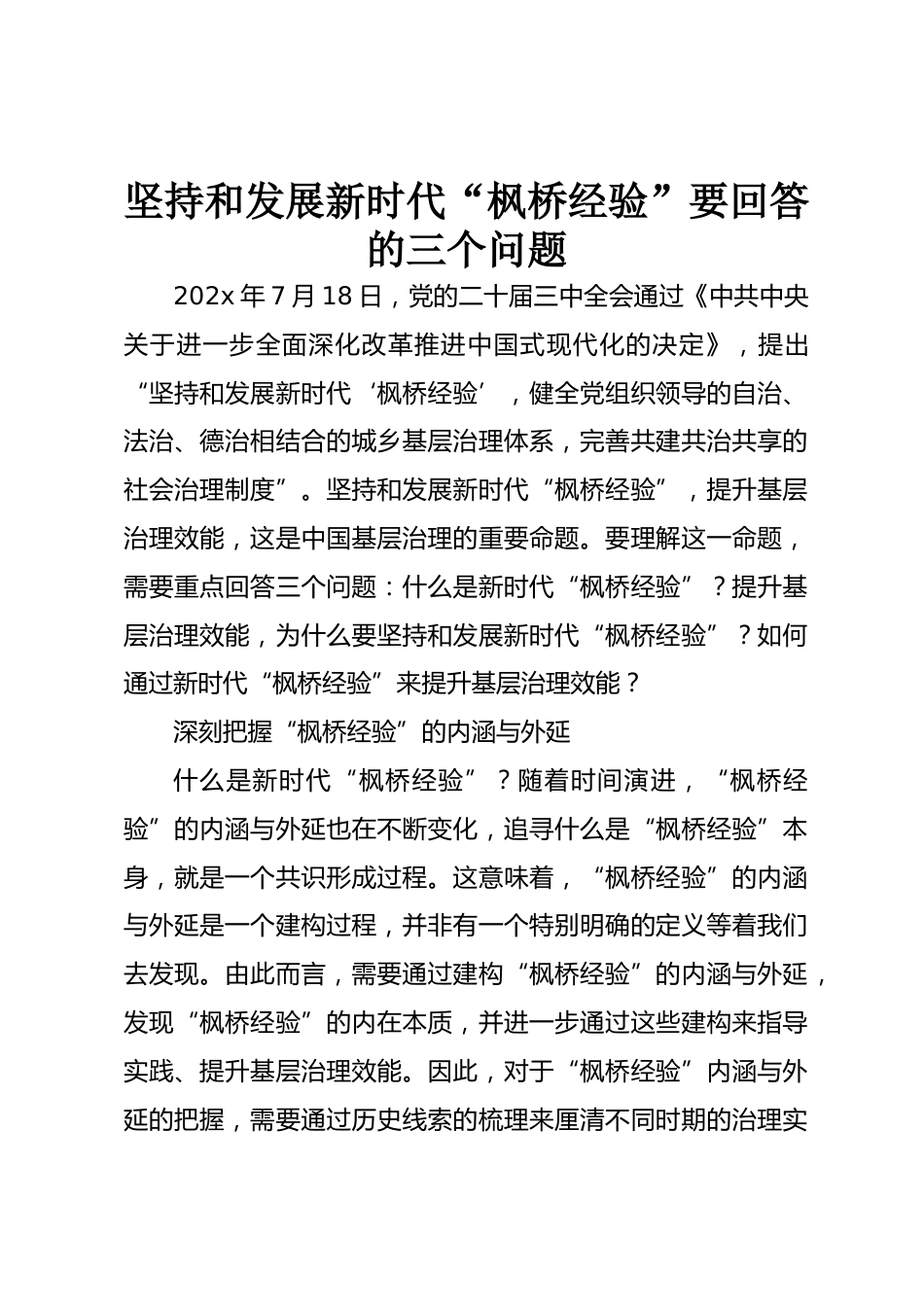 堅持和發(fā)展新時代“楓橋經(jīng)驗”要回答的三個問題202x年7月18日,黨的二十屆三中全會通過《中共中央關(guān)于進一步全面深化改革推進中國式現(xiàn)代化的決定》,提出“堅持和發(fā)展新時代‘楓橋經(jīng)驗’,健全黨組織領(lǐng)導的自治、法治、德治相結(jié)合的城鄉(xiāng)基層治理體系,完善共建共治共享的社會治理制度”。堅持和發(fā)展新時代“楓橋經(jīng)驗”,提升基層治理效能,這是中國基層治理的重要命題。要理解這一命題,需要重點回答三個問題:什么是新時代“楓橋經(jīng)驗”?提升基層治理效能,為什么要堅持和發(fā)展新時代“楓橋經(jīng)驗”?如何通過新時代“楓橋經(jīng)驗”來提升基層治理效能?深刻把握“楓橋經(jīng)驗”...