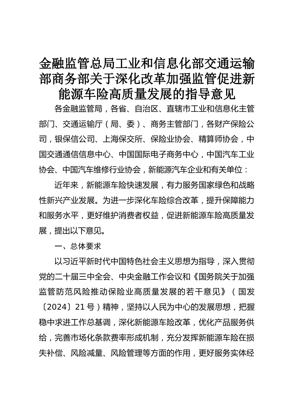 金融監(jiān)管總局 工業(yè)和信息化部 交通運輸部 商務(wù)部關(guān)于深化改革加強(qiáng)監(jiān)管促進(jìn)新能源車險高質(zhì)量發(fā)展的指導(dǎo)意見