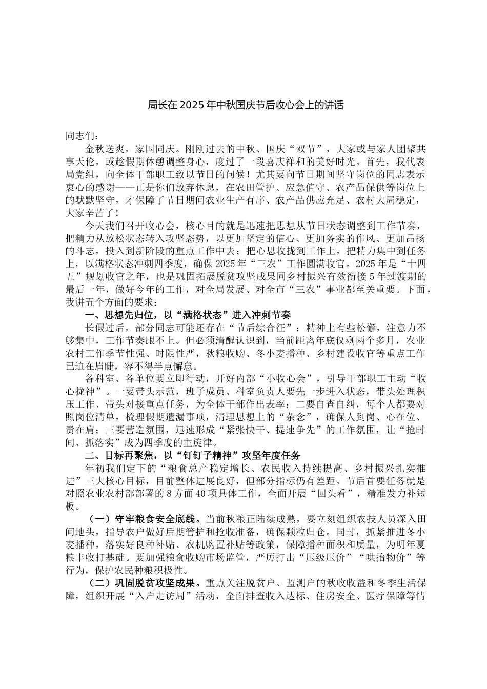 局長在2025年中秋國慶節(jié)后收心會上的講話