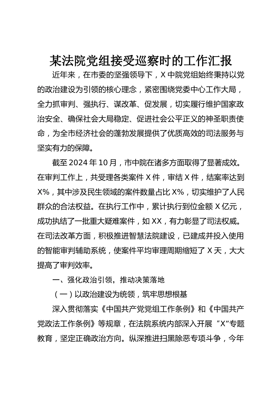 某法院黨組接受巡察時的工作匯報近年來,在市委的堅強(qiáng)領(lǐng)導(dǎo)下,X中院黨組始終秉持以黨的政治建設(shè)為引領(lǐng)的核心理念,緊密圍繞黨委中心工作大局,全力抓審判、強(qiáng)執(zhí)行、謀改革、促發(fā)展,切實(shí)履行維護(hù)國家政治安全、確保社會大局穩(wěn)定、促進(jìn)社會公平正義的神圣職責(zé)使命,為全市經(jīng)濟(jì)社會的蓬勃發(fā)展提供了優(yōu)質(zhì)高效的司法服務(wù)與堅實(shí)有力的保障。截至2024年10月,市中院在諸多方面取得了顯著成效。在審判工作上,共受理各類案件X件,審結(jié)X件,結(jié)案率達(dá)到X%,其中涉及民生領(lǐng)域的案件數(shù)量占比X%,切實(shí)維護(hù)了人民群眾的合法權(quán)益。在執(zhí)行工作中,累計執(zhí)行到位金額X億元,成功執(zhí)結(jié)了一批...