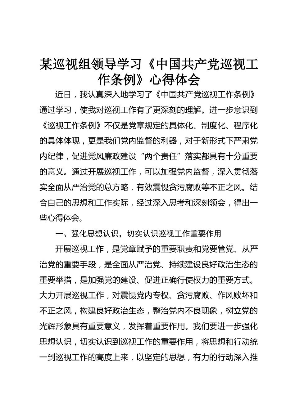 某巡視組領(lǐng)導(dǎo)學(xué)習(xí)《中國共產(chǎn)黨巡視工作條例》心得體會VIP免費