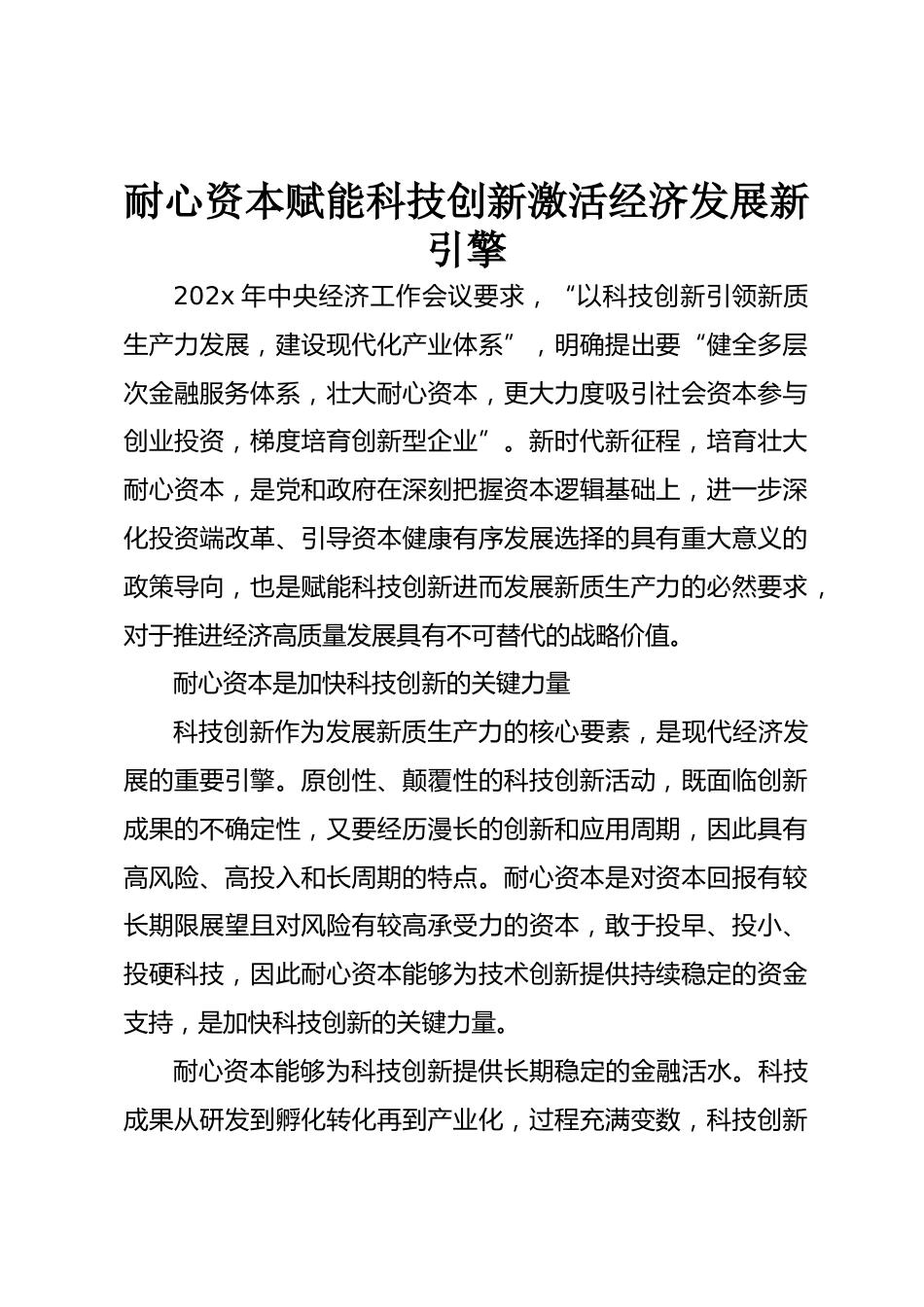 耐心資本賦能科技創(chuàng)新激活經(jīng)濟(jì)發(fā)展新引擎202x年中央經(jīng)濟(jì)工作會(huì)議要求,“以科技創(chuàng)新引領(lǐng)新質(zhì)生產(chǎn)力發(fā)展,建設(shè)現(xiàn)代化產(chǎn)業(yè)體系”,明確提出要“健全多層次金融服務(wù)體系,壯大耐心資本,更大力度吸引社會(huì)資本參與創(chuàng)業(yè)投資,梯度培育創(chuàng)新型企業(yè)”。新時(shí)代新征程,培育壯大耐心資本,是黨和政府在深刻把握資本邏輯基礎(chǔ)上,進(jìn)一步深化投資端改革、引導(dǎo)資本健康有序發(fā)展選擇的具有重大意義的政策導(dǎo)向,也是賦能科技創(chuàng)新進(jìn)而發(fā)展新質(zhì)生產(chǎn)力的必然要求,對(duì)于推進(jìn)經(jīng)濟(jì)高質(zhì)量發(fā)展具有不可替代的戰(zhàn)略價(jià)值。耐心資本是加快科技創(chuàng)新的關(guān)鍵力量科技創(chuàng)新作為發(fā)展新質(zhì)生產(chǎn)力的核心要素,是...