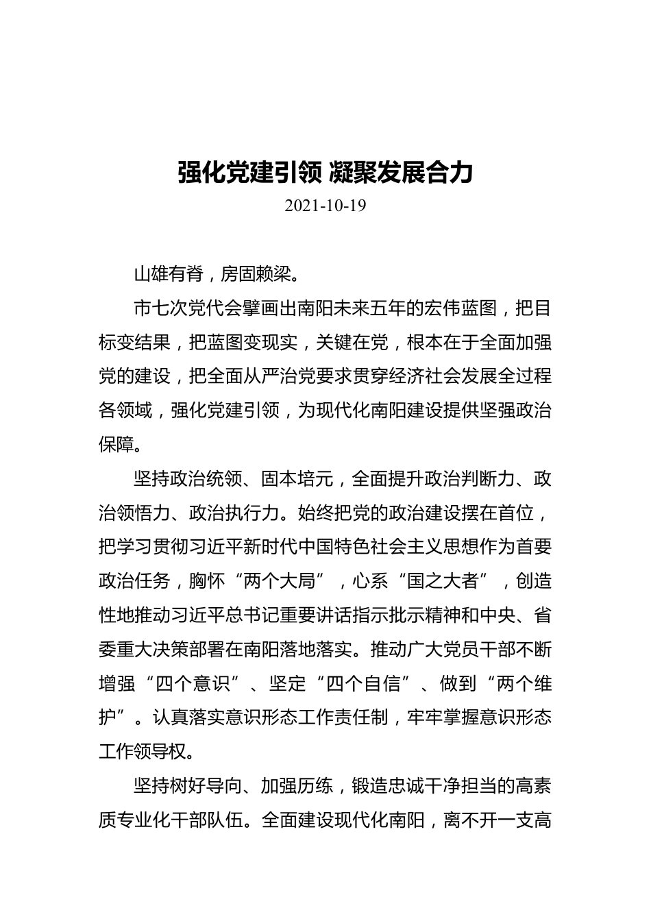 強(qiáng)化黨建引領(lǐng)凝聚發(fā)展合力2021-10-19山雄有脊,房固賴梁。市七次黨代會擘畫出南陽未來五年的宏偉藍(lán)圖,把目標(biāo)變結(jié)果,把藍(lán)圖變現(xiàn)實(shí),關(guān)鍵在黨,根本在于全面加強(qiáng)黨的建設(shè),把全面從嚴(yán)治黨要求貫穿經(jīng)濟(jì)社會發(fā)展全過程各領(lǐng)域,強(qiáng)化黨建引領(lǐng),為現(xiàn)代化南陽建設(shè)提供堅(jiān)強(qiáng)政治保障。堅(jiān)持政治統(tǒng)領(lǐng)、固本培元,全面提升政治判斷力、政治領(lǐng)悟力、政治執(zhí)行力。始終把黨的政治建設(shè)擺在首位,把學(xué)習(xí)貫徹習(xí)近平新時(shí)代中國特色社會主義思想作為首要政治任務(wù),胸懷“兩個(gè)大局”,心系“國之大者”,創(chuàng)造性地推動(dòng)習(xí)近平總書記重要講話指示批示精神和中央、省委重大決策部署在南陽落地落實(shí)...