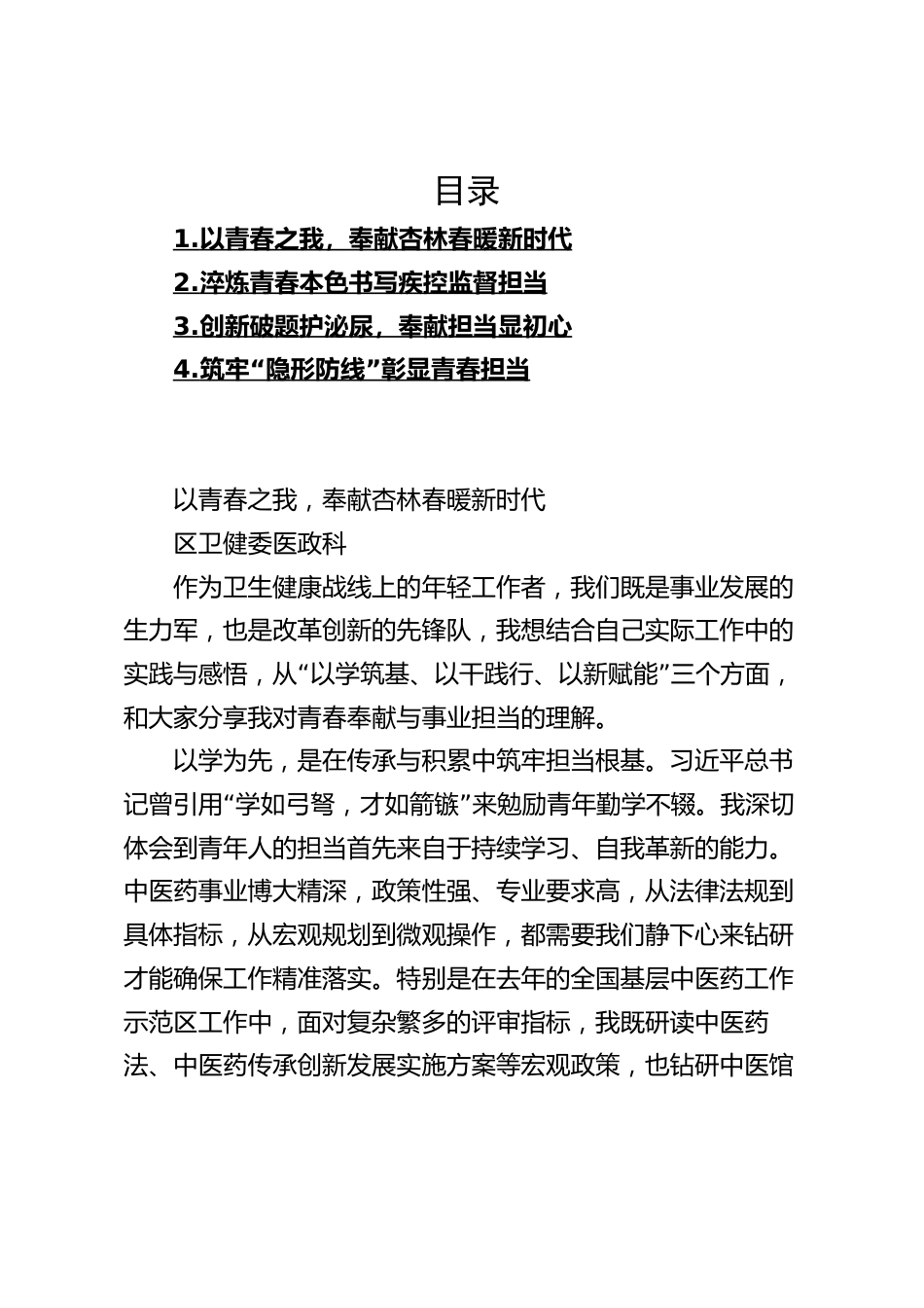 目錄1.以青春之我,奉獻(xiàn)杏林春暖新時(shí)代2.淬煉青春本色書寫疾控監(jiān)督擔(dān)當(dāng)3.創(chuàng)新破題護(hù)泌尿,奉獻(xiàn)擔(dān)當(dāng)顯初心4.“”筑牢隱形防線彰顯青春擔(dān)當(dāng)以青春之我,奉獻(xiàn)杏林春暖新時(shí)代區(qū)衛(wèi)健委醫(yī)政科作為衛(wèi)生健康戰(zhàn)線上的年輕工作者,我們既是事業(yè)發(fā)展的生力軍,也是改革創(chuàng)新的先鋒隊(duì),我想結(jié)合自己實(shí)際工作中的“”實(shí)踐與感悟,從以學(xué)筑基、以干踐行、以新賦能三個(gè)方面,和大家分享我對(duì)青春奉獻(xiàn)與事業(yè)擔(dān)當(dāng)?shù)睦斫?。以學(xué)為先,是在傳承與積累中筑牢擔(dān)當(dāng)根基。習(xí)近平總書“”記曾引用學(xué)如弓弩,才如箭鏃來勉勵(lì)青年勤學(xué)不輟。我深切體會(huì)到青年人的擔(dān)當(dāng)首先來自于持續(xù)學(xué)習(xí)、自我革新的能力...