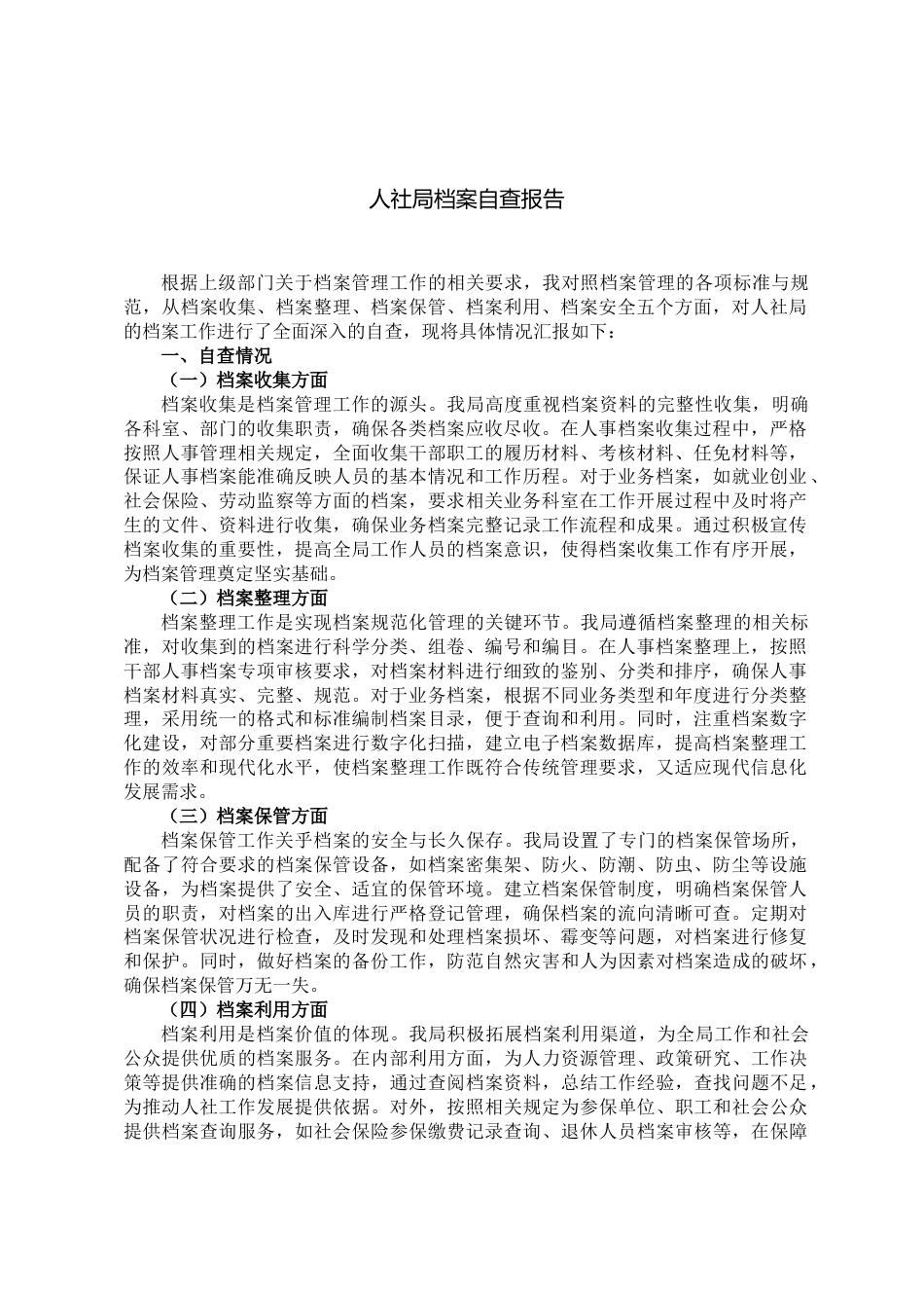 人社局檔案自查報告根據(jù)上級部門關于檔案管理工作的相關要求,我對照檔案管理的各項標準與規(guī)范,從檔案收集、檔案整理、檔案保管、檔案利用、檔案安全五個方面,對人社局的檔案工作進行了全面深入的自查,現(xiàn)將具體情況匯報如下:一、自查情況(一)檔案收集方面檔案收集是檔案管理工作的源頭。我局高度重視檔案資料的完整性收集,明確各科室、部門的收集職責,確保各類檔案應收盡收。在人事檔案收集過程中,嚴格按照人事管理相關規(guī)定,全面收集干部職工的履歷材料、考核材料、任免材料等,保證人事檔案能準確反映人員的基本情況和工作歷程。對于業(yè)務檔案,如就業(yè)創(chuàng)業(yè)、社...