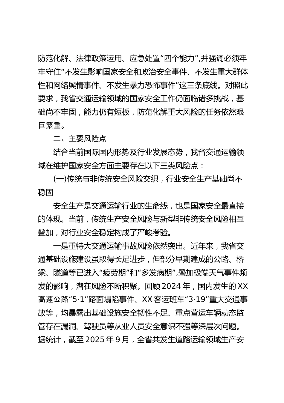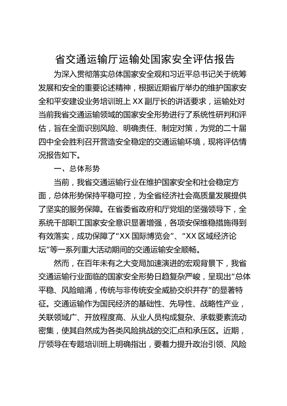 省交通運(yùn)輸廳運(yùn)輸處國家安全評(píng)估報(bào)告為深入貫徹落實(shí)總體國家安全觀和習(xí)近平總書記關(guān)于統(tǒng)籌發(fā)展和安全的重要論述精神,根據(jù)近期省廳舉辦的維護(hù)國家安全和平安建設(shè)業(yè)務(wù)培訓(xùn)班上XX副廳長的講話要求,運(yùn)輸處對(duì)當(dāng)前我省交通運(yùn)輸領(lǐng)域的國家安全形勢(shì)進(jìn)行了系統(tǒng)性研判和評(píng)估,旨在全面識(shí)別風(fēng)險(xiǎn)、明確責(zé)任、制定對(duì)策,為黨的二十屆四中全會(huì)勝利召開營造安全穩(wěn)定的交通運(yùn)輸環(huán)境,現(xiàn)將評(píng)估情況報(bào)告如下。一、總體形勢(shì)當(dāng)前,我省交通運(yùn)輸行業(yè)在維護(hù)國家安全和社會(huì)穩(wěn)定方面,總體形勢(shì)保持平穩(wěn)可控,為全省經(jīng)濟(jì)社會(huì)高質(zhì)量發(fā)展提供了堅(jiān)實(shí)的服務(wù)保障。在省委省政府和廳黨組的堅(jiān)強(qiáng)領(lǐng)導(dǎo)下,...