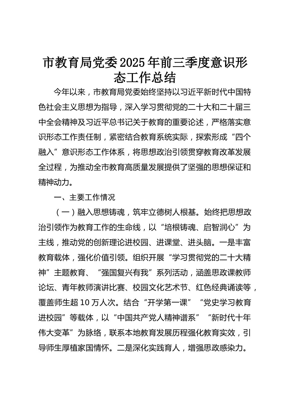 市教育局黨委2025年前三季度意識(shí)形態(tài)工作總結(jié)今年以來(lái),市教育局黨委始終堅(jiān)持以習(xí)近平新時(shí)代中國(guó)特色社會(huì)主義思想為指導(dǎo),深入學(xué)習(xí)貫徹黨的二十大和二十屆三中全會(huì)精神及習(xí)近平總書記關(guān)于教育的重要論述,嚴(yán)格落實(shí)意識(shí)形態(tài)工作責(zé)任制,緊密結(jié)合教育系統(tǒng)實(shí)際,探索形成“四個(gè)融入”意識(shí)形態(tài)工作體系,將思想政治引領(lǐng)貫穿教育改革發(fā)展全過(guò)程,為推動(dòng)全市教育高質(zhì)量發(fā)展提供了堅(jiān)強(qiáng)的思想保證和精神動(dòng)力。一、主要工作情況(一)融入思想鑄魂,筑牢立德樹(shù)人根基。始終把思想政治引領(lǐng)作為教育工作的生命線,以“培根鑄魂、啟智潤(rùn)心”為主線,推動(dòng)黨的創(chuàng)新理論進(jìn)校園、進(jìn)課堂、...