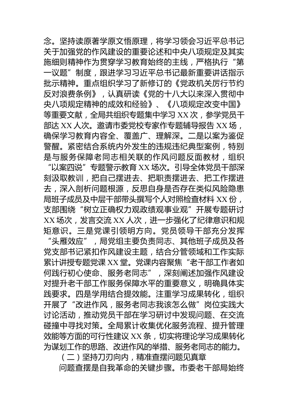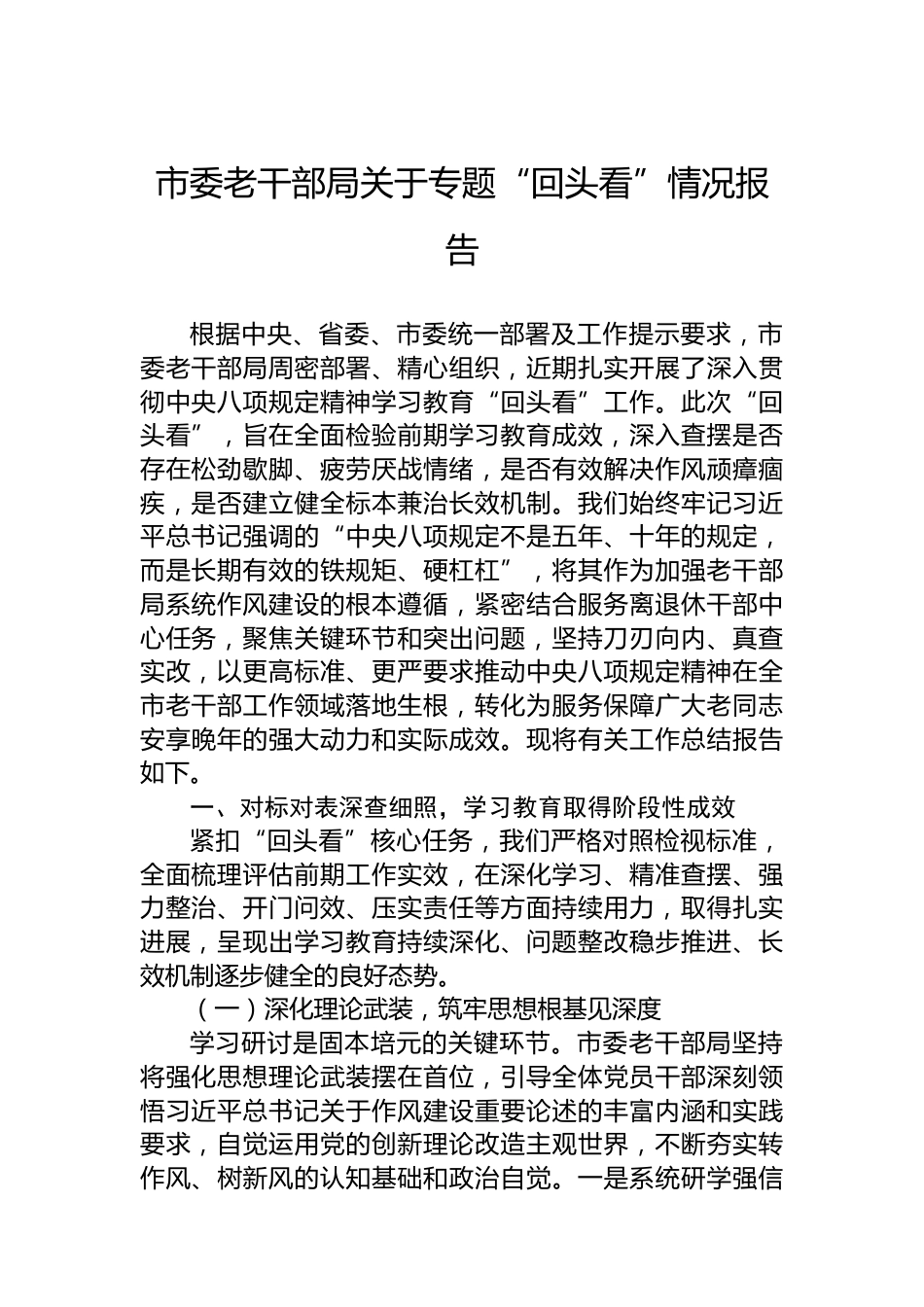 市委老干部局關于專題“回頭看”情況報告根據(jù)中央、省委、市委統(tǒng)一部署及工作提示要求,市委老干部局周密部署、精心組織,近期扎實開展了深入貫徹中央八項規(guī)定精神學習教育“回頭看”工作。此次“回頭看”,旨在全面檢驗前期學習教育成效,深入查擺是否存在松勁歇腳、疲勞厭戰(zhàn)情緒,是否有效解決作風頑瘴痼疾,是否建立健全標本兼治長效機制。我們始終牢記習近平總書記強調(diào)的“中央八項規(guī)定不是五年、十年的規(guī)定,而是長期有效的鐵規(guī)矩、硬杠杠”,將其作為加強老干部局系統(tǒng)作風建設的根本遵循,緊密結合服務離退休干部中心任務,聚焦關鍵環(huán)節(jié)和突出問題,堅持刀刃向內(nèi)、...