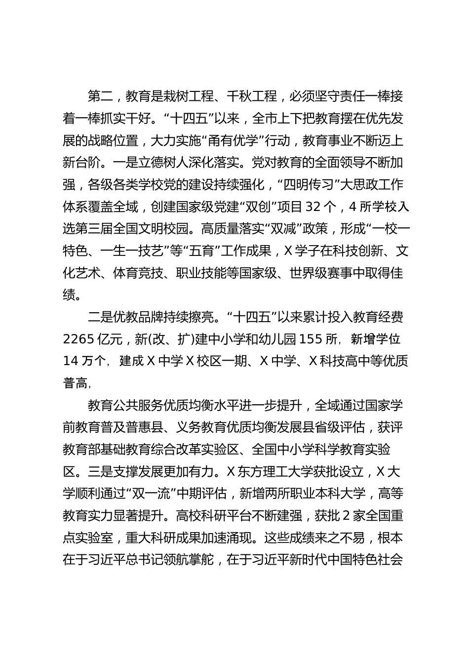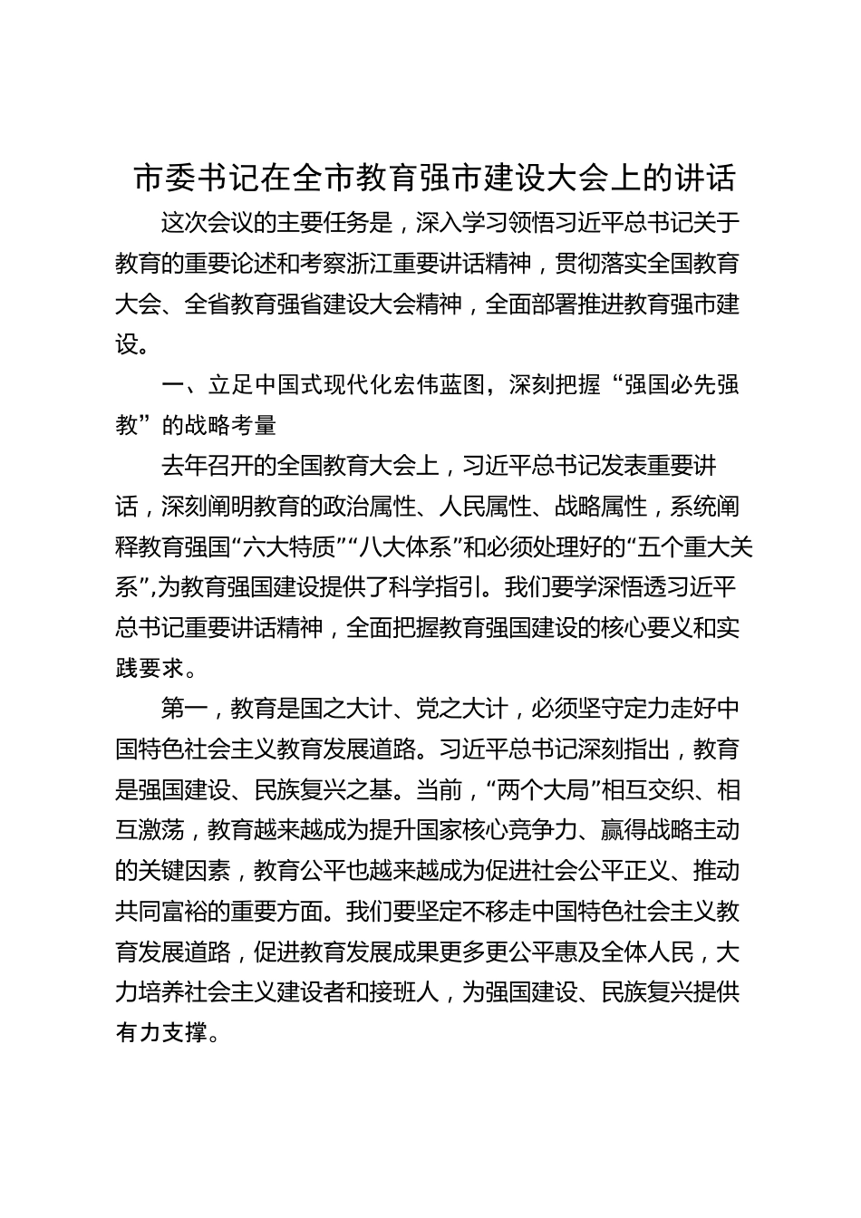 市委書記在全市教育強市建設(shè)大會上的講話這次會議的主要任務(wù)是,深入學(xué)習(xí)領(lǐng)悟習(xí)近平總書記關(guān)于教育的重要論述和考察浙江重要講話精神,貫徹落實全國教育大會、全省教育強省建設(shè)大會精神,全面部署推進教育強市建設(shè)。一、立足中國式現(xiàn)代化宏偉藍圖,深刻把握“強國必先強教”的戰(zhàn)略考量去年召開的全國教育大會上,習(xí)近平總書記發(fā)表重要講話,深刻闡明教育的政治屬性、人民屬性、戰(zhàn)略屬性,系統(tǒng)闡“”“”“釋教育強國六大特質(zhì)八大體系和必須處理好的五個重大關(guān)”系,為教育強國建設(shè)提供了科學(xué)指引。我們要學(xué)深悟透習(xí)近平總書記重要講話精神,全面把握教育強國建設(shè)的核心要...