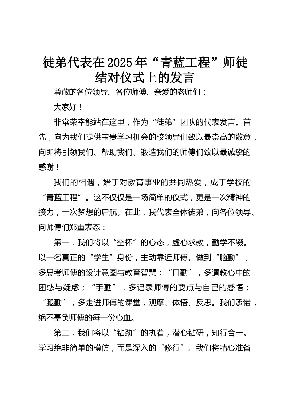 徒弟代表在2025年“青藍(lán)工程”師徒結(jié)對(duì)儀式上的發(fā)言尊敬的各位領(lǐng)導(dǎo)、各位師傅、親愛(ài)的老師們:大家好!非常榮幸能站在這里,作為“徒弟”團(tuán)隊(duì)的代表發(fā)言。首先,向?yàn)槲覀兲峁氋F學(xué)習(xí)機(jī)會(huì)的校領(lǐng)導(dǎo)們致以最崇高的敬意,向即將引領(lǐng)我們、幫助我們、鍛造我們的師傅們致以最誠(chéng)摯的感謝!我們的相遇,始于對(duì)教育事業(yè)的共同熱愛(ài),成于學(xué)校的“青藍(lán)工程”。這不僅僅是一場(chǎng)簡(jiǎn)單的儀式,更是一次精神的接力,一次夢(mèng)想的啟航。在此,我代表全體徒弟,向各位領(lǐng)導(dǎo)、向師傅們鄭重表態(tài):第一,我們將以“空杯”的心態(tài),虛心求教,勤學(xué)不輟。以一名真正的“學(xué)生”身份,主動(dòng)靠近師傅。做...