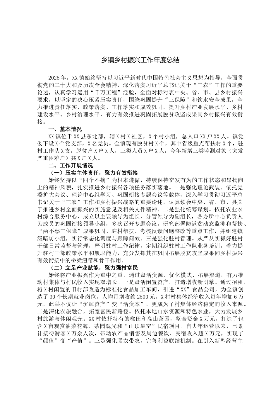 鄉(xiāng)鎮(zhèn)鄉(xiāng)村振興工作年度總結(jié)2025年,XX鎮(zhèn)始終堅持以習(xí)近平新時代中國特色社會主義思想為指導(dǎo),全面貫徹黨的二十大和及歷次全會精神,深化落實習(xí)近平總書記關(guān)于“三農(nóng)”工作的重要論述,認(rèn)真學(xué)習(xí)運用“千萬工程”經(jīng)驗,全面對標(biāo)對表中央、省、市、縣鄉(xiāng)村振興要求,以堅定的決心壓緊壓實責(zé)任,圍繞鞏固提升“三保障”和飲水安全成果,全力推進(jìn)責(zé)任落實、政策落實、工作落實和成效鞏固,提升鄉(xiāng)村產(chǎn)業(yè)發(fā)展水平、鄉(xiāng)村建設(shè)水平、鄉(xiāng)村治理水平,有力有效推進(jìn)鞏固拓展脫貧攻堅成果同鄉(xiāng)村振興有效銜接。一、基本情況XX鎮(zhèn)位于XX縣東北部,轄X村X社區(qū),X個村小組,總?cè)丝赬X戶XX人。鎮(zhèn)...