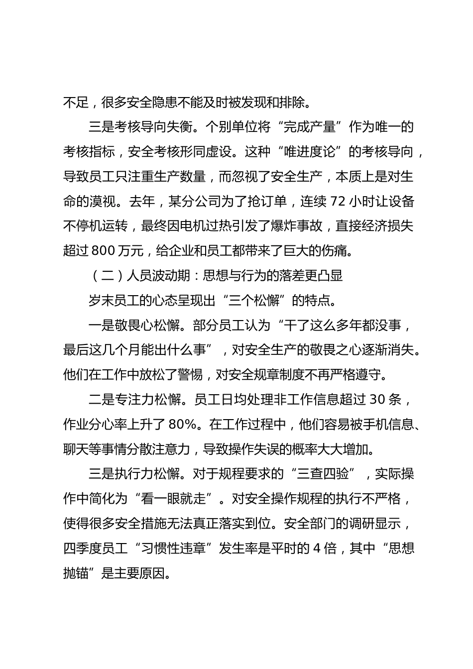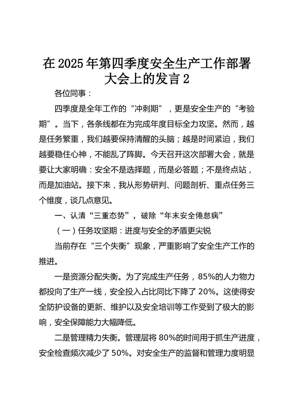 在2025年第四季度安全生產(chǎn)工作部署大會上的發(fā)言2各位同事:四季度是全年工作的“沖刺期”,更是安全生產(chǎn)的“考驗期”。當(dāng)下,各條線都在為完成年度目標(biāo)全力攻堅。然而,越是任務(wù)繁重,我們越要保持清醒的頭腦;越是時間緊迫,我們越要穩(wěn)住心神,不能亂了陣腳。今天召開這次部署大會,就是要讓大家明確:安全不是選擇題,而是必答題;不是終點站,而是加油站。接下來,我從形勢研判、問題剖析、重點任務(wù)三個維度,談幾點意見。一、認(rèn)清“三重態(tài)勢”,破除“年末安全倦怠病”(一)任務(wù)攻堅期:進(jìn)度與安全的矛盾更尖銳當(dāng)前存在“三個失衡”現(xiàn)象,嚴(yán)重影響了安全生產(chǎn)工作的...