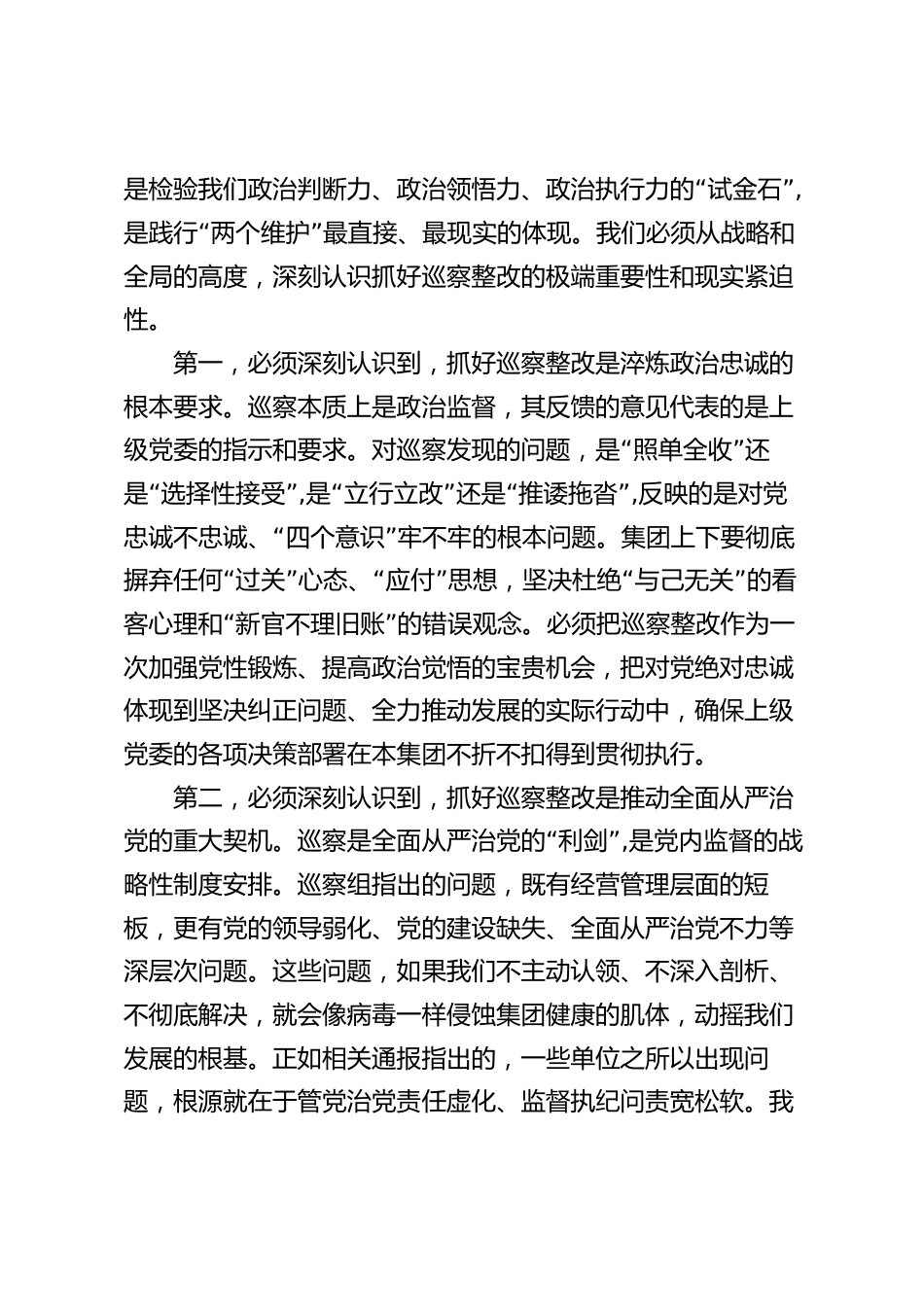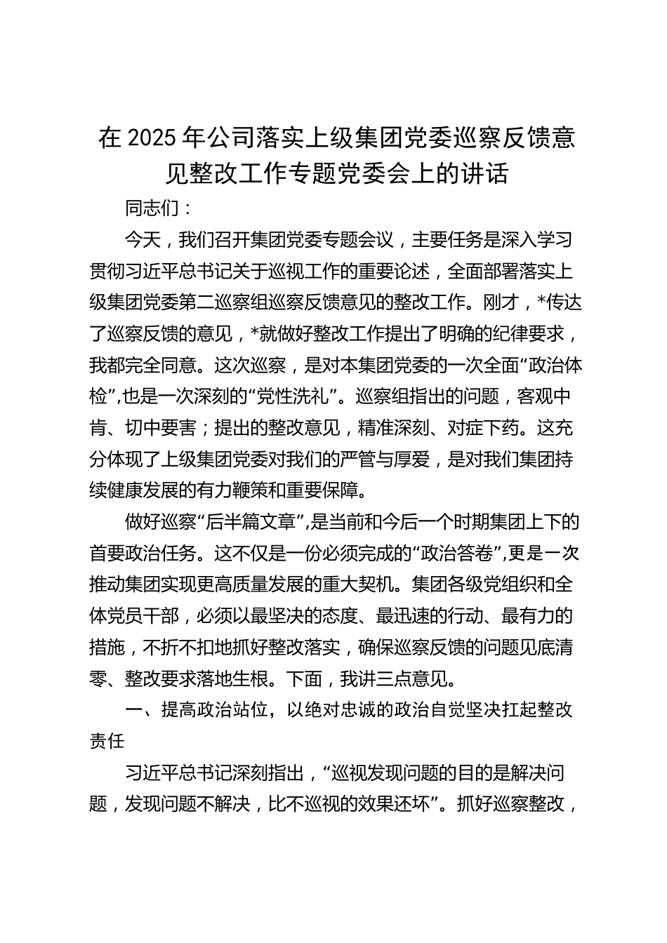 在2025年公司落實(shí)上級集團(tuán)黨委巡察反饋意見整改工作專題黨委會上的講話同志們:今天,我們召開集團(tuán)黨委專題會議,主要任務(wù)是深入學(xué)習(xí)貫徹習(xí)近平總書記關(guān)于巡視工作的重要論述,全面部署落實(shí)上級集團(tuán)黨委第二巡察組巡察反饋意見的整改工作。剛才,*傳達(dá)了巡察反饋的意見,*就做好整改工作提出了明確的紀(jì)律要求,“我都完全同意。這次巡察,是對本集團(tuán)黨委的一次全面政治體”檢,“”也是一次深刻的黨性洗禮。巡察組指出的問題,客觀中肯、切中要害;提出的整改意見,精準(zhǔn)深刻、對癥下藥。這充分體現(xiàn)了上級集團(tuán)黨委對我們的嚴(yán)管與厚愛,是對我們集團(tuán)持續(xù)健康發(fā)展的有力鞭策...