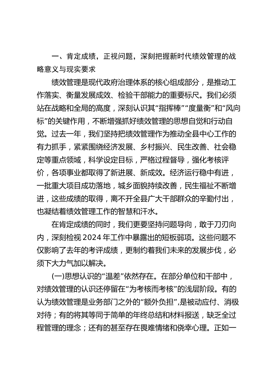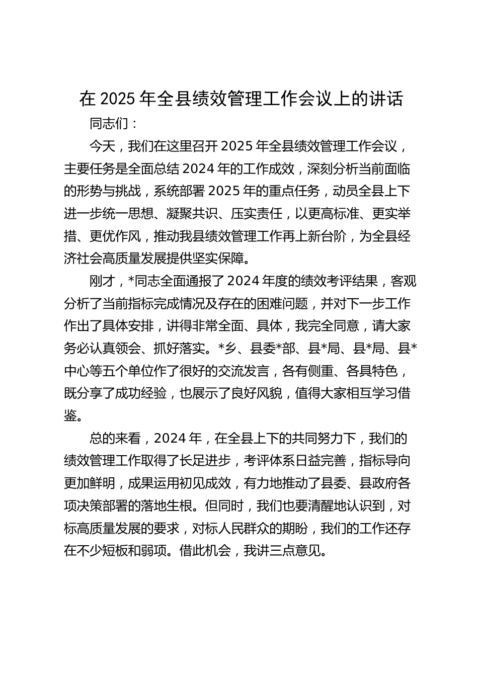 在2025年全縣績效管理工作會議上的講話同志們:今天,我們在這里召開2025年全縣績效管理工作會議,主要任務是全面總結2024年的工作成效,深刻分析當前面臨的形勢與挑戰(zhàn),系統(tǒng)部署2025年的重點任務,動員全縣上下進一步統(tǒng)一思想、凝聚共識、壓實責任,以更高標準、更實舉措、更優(yōu)作風,推動我縣績效管理工作再上新臺階,為全縣經(jīng)濟社會高質量發(fā)展提供堅實保障。剛才,*同志全面通報了2024年度的績效考評結果,客觀分析了當前指標完成情況及存在的困難問題,并對下一步工作作出了具體安排,講得非常全面、具體,我完全同意,請大家務必認真領會、抓好落實。*鄉(xiāng)、縣委*部、...