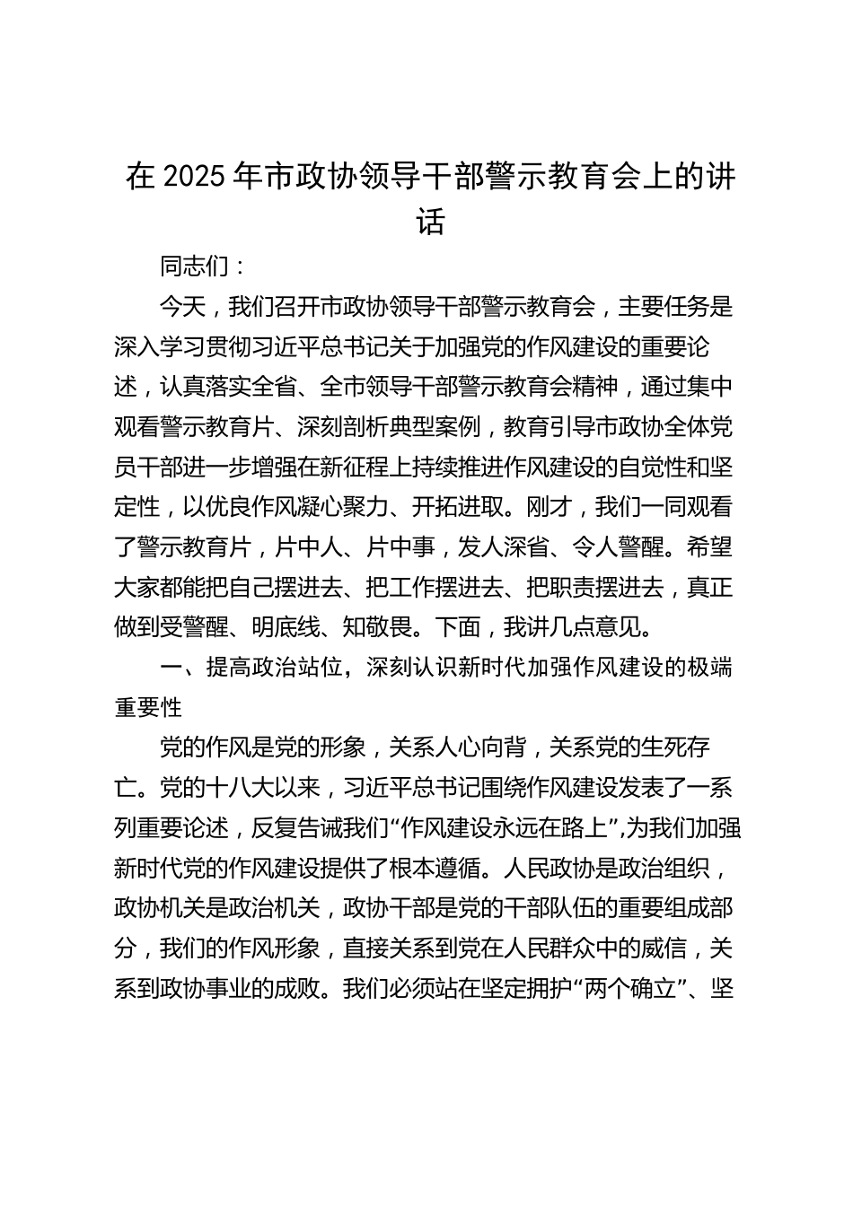 在2025年市政協(xié)領導干部警示教育會上的講話同志們:今天,我們召開市政協(xié)領導干部警示教育會,主要任務是深入學習貫徹習近平總書記關于加強黨的作風建設的重要論述,認真落實全省、全市領導干部警示教育會精神,通過集中觀看警示教育片、深刻剖析典型案例,教育引導市政協(xié)全體黨員干部進一步增強在新征程上持續(xù)推進作風建設的自覺性和堅定性,以優(yōu)良作風凝心聚力、開拓進取。剛才,我們一同觀看了警示教育片,片中人、片中事,發(fā)人深省、令人警醒。希望大家都能把自己擺進去、把工作擺進去、把職責擺進去,真正做到受警醒、明底線、知敬畏。下面,我講幾點意見。一、提高...