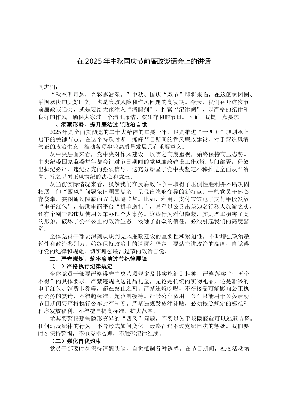 在2025年中秋國慶節(jié)前廉政談話會上的講話材料