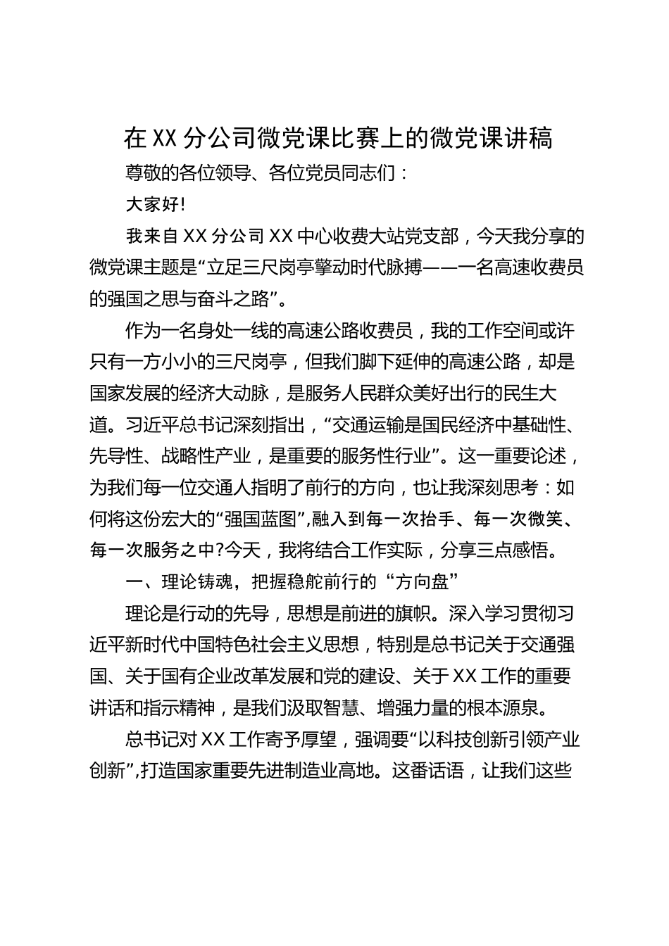 在XX分公司微黨課比賽上的微黨課講稿尊敬的各位領(lǐng)導(dǎo)、各位黨員同志們:大家好!我來自XX分公司XX中心收費大站黨支部,今天我分享的“微黨課主題是立足三尺崗?fù)で鎰訒r代脈搏——一名高速收費員”的強國之思與奮斗之路。作為一名身處一線的高速公路收費員,我的工作空間或許只有一方小小的三尺崗?fù)?,但我們腳下延伸的高速公路,卻是國家發(fā)展的經(jīng)濟大動脈,是服務(wù)人民群眾美好出行的民生大“道。習(xí)近平總書記深刻指出,交通運輸是國民經(jīng)濟中基礎(chǔ)性、”先導(dǎo)性、戰(zhàn)略性產(chǎn)業(yè),是重要的服務(wù)性行業(yè)。這一重要論述,為我們每一位交通人指明了前行的方向,也讓我深刻思考:如“”何...